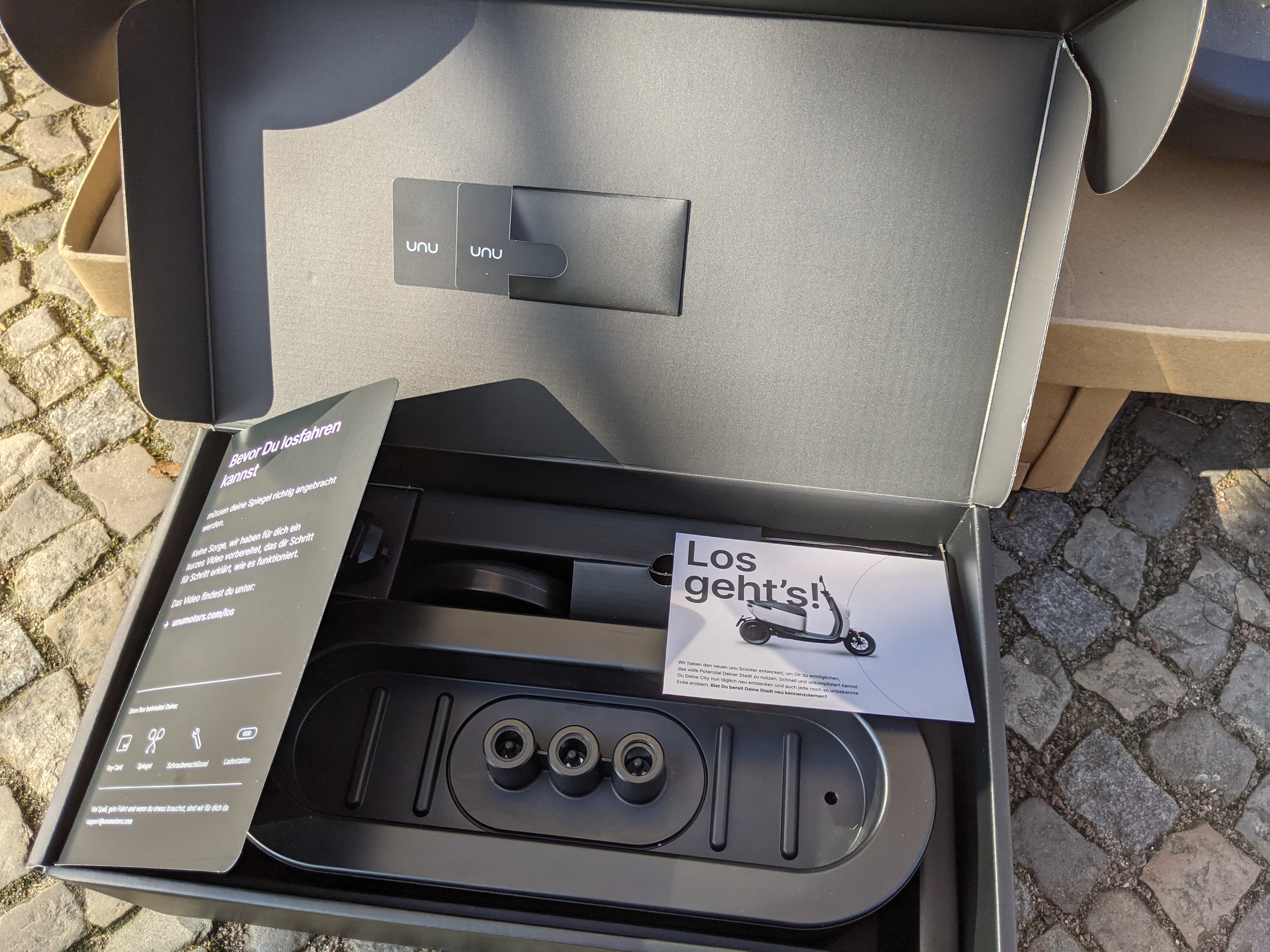 Ich empfehle eine zweite Person um den Roller aus der Verpackung zu hieven. Sonst ist der "Aufbau" tatsächlich sehr einfach: bloß die Spiegel befestigen. Der Akku war zu 45% geladen, hätte also direkt losfahren können.