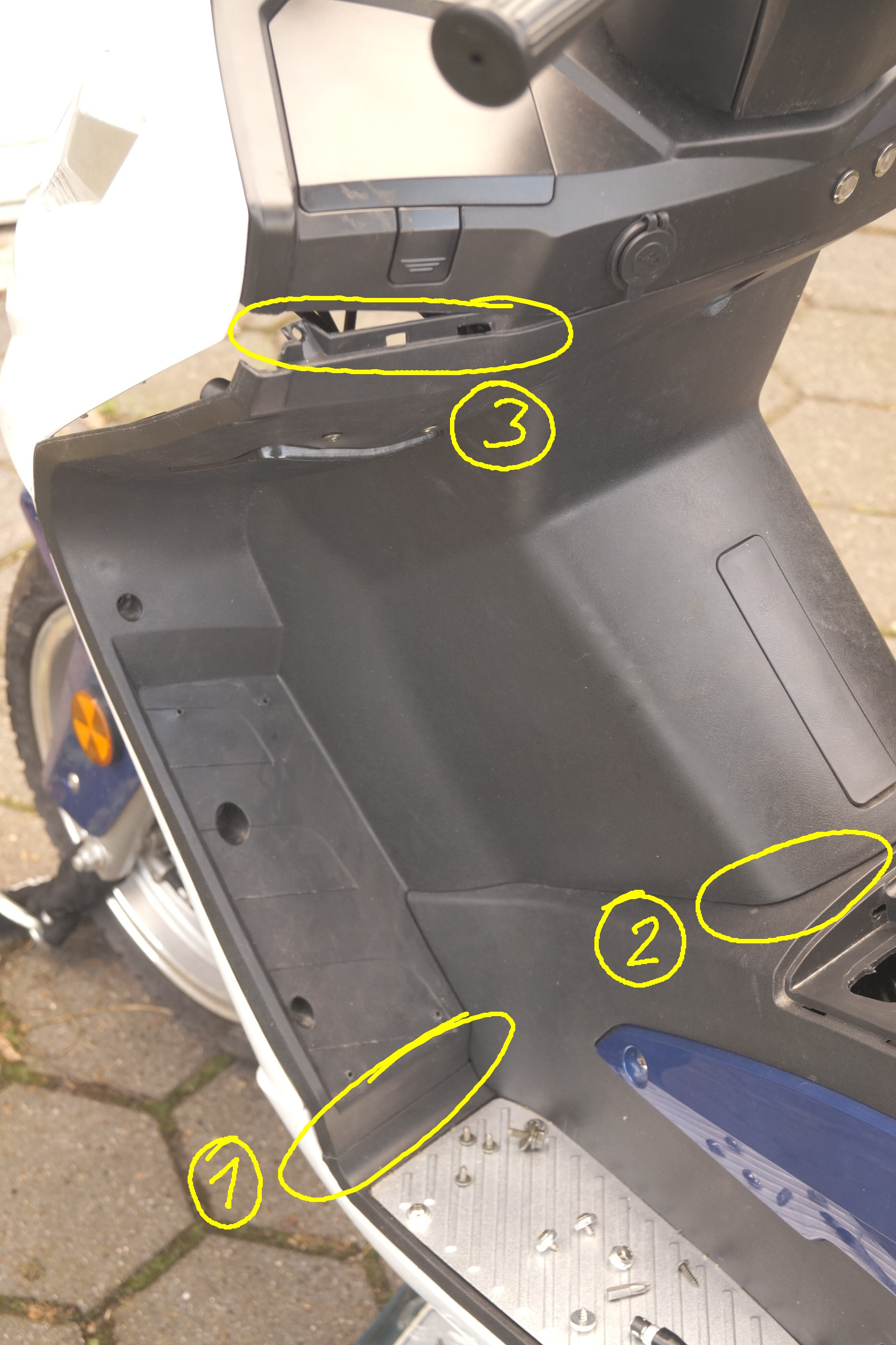 Ich versuche gerade, beim Jupiter von 2019 einen Teil der Kunststoffverkleidung zu demontieren, um Zugang zum Ladegerät zu bekommen, siehe Bild.
