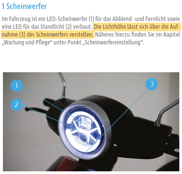 Auf Seite 27 heißt es dann: "[...] die Leuchtweite über die Befestigungsschraube des Scheinwerfers einstellen."