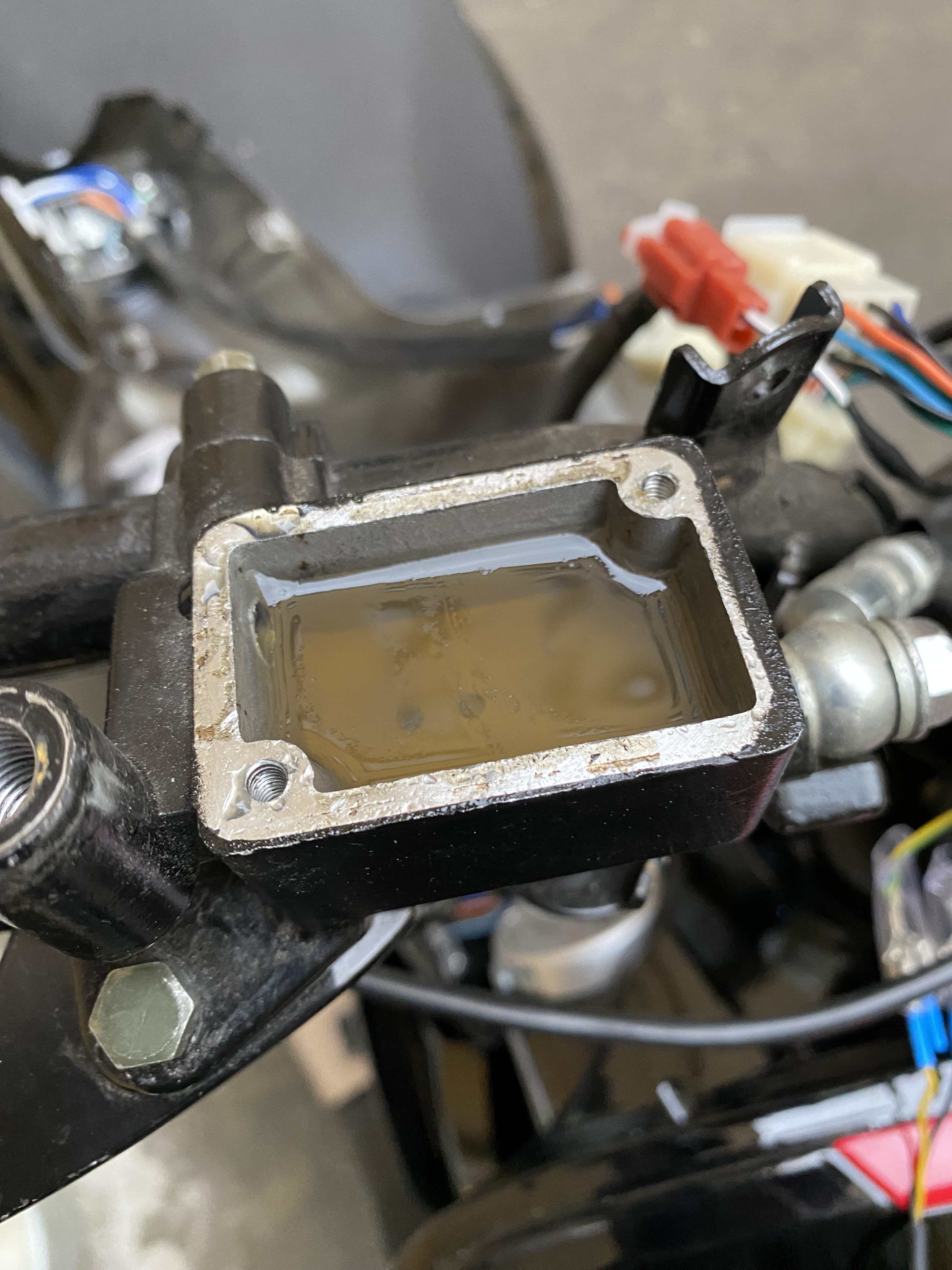 Whatever….da die Bremsen ja zuvor auch kuriose, wenn auch nur leichte, Geräusche machte, schraubte ich prokrastinierend die Bremsflüssigkeitesbehälter auf, laut Vorbesitzer war der Roller nämlich noch nie gewartet worden (Uranus 45kmh von 2020, ca 3000km)).