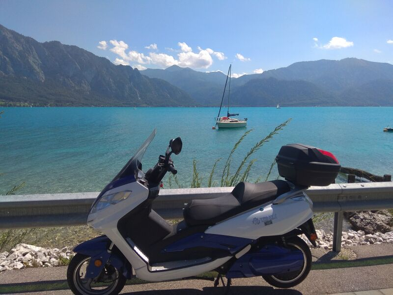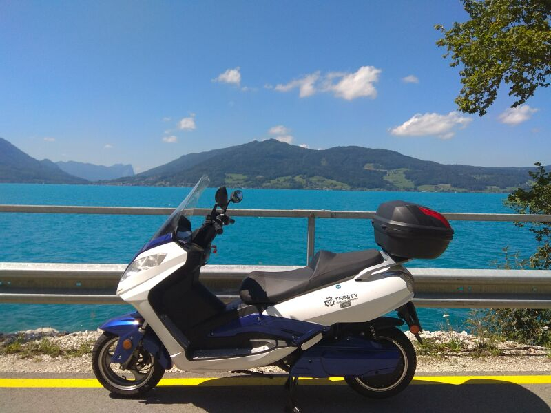 Bin diese Woche mal zu einer " Langstrecke " aufgebrochen . Ein mal um den Attersee. ca 90 Km . Der Jupiter war Vollgelaten ( 83,5 V ) und ich bin "gemütlich " gefahren . Hatte es ja nicht Eilig bei den schönen Wetter . Zuhause zeigte der Tacho den 95,5 km an . Die Solarladung mit ca 300 W tauerte dann auch fast 1,5 Tage . Habe 3,4Kw geladen . Mein Ziel beim Kauf war das ich einmal um den See fahren kann und das geht leicht .