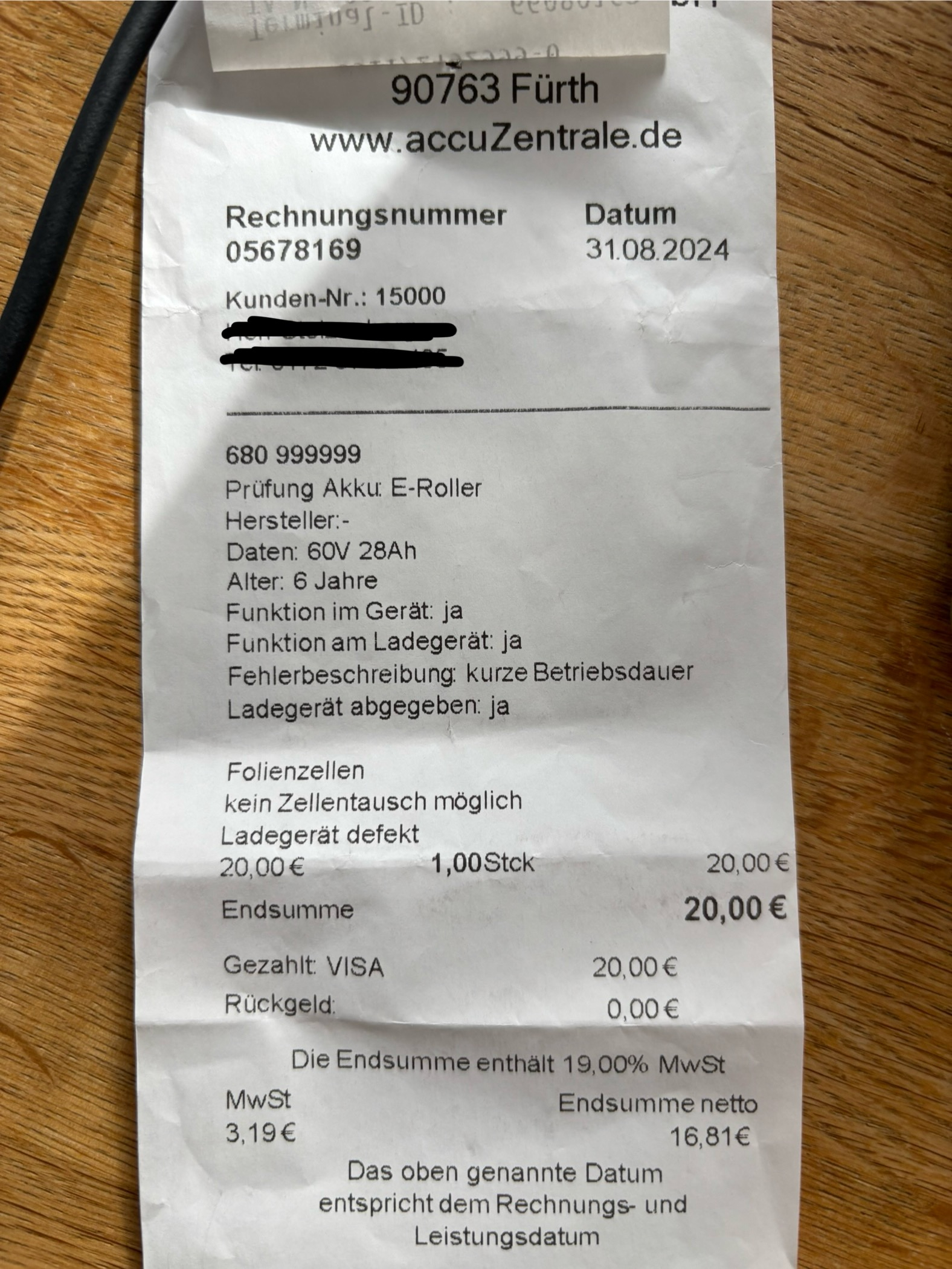 Die Höhe der Rechnung geht für mich auch in Ordnung, auch wurde mir der Akku ohne Probleme ausgehändigt.