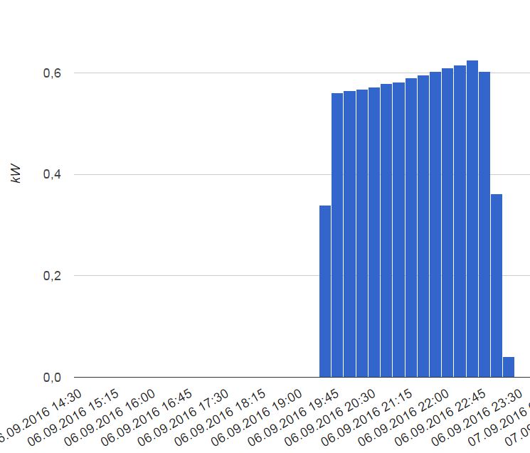 Ich bin jetzt bei 400 km angekommen. Der Roller läuft sehr zuverlässig. Die angegebene Akkureichweite stimmt. Ich hoffe, mein bestellter L3-Akku kommt auch demnächst. Zur Zeit lade ich abends ca. 2..3h über einen smart-me Energiemesser (https://www.amazon.de/dp/B01I3J73KE/ref ... 21_TE_dp_1) ca. 1,5kWh. Die Ladekurve sieht so aus: Auf dem Handy kann ich im Wohnzimmer den Ladevorgang verfolgen. Wird eine einstellbare Leistung unterschritten, schaltet der Energiemesser das Ladegerät ab und trennt es vom Netz und schickt mir eine Email.