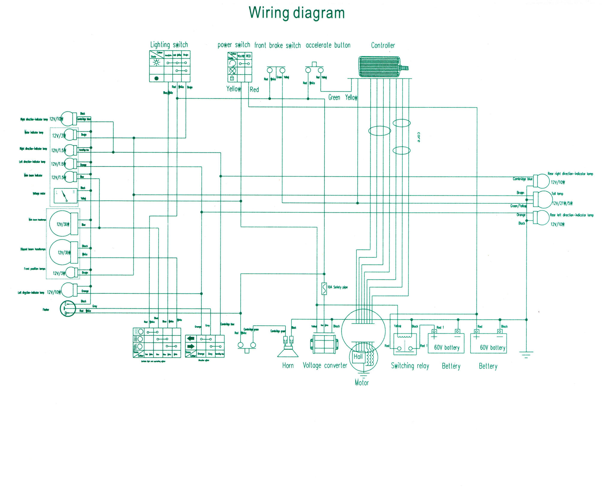 1. Ein Controller braucht 60V Fahrspannung von der Batterie. 2. 60V Steuerspannung vom Zündschloß. 3. Gibt 5V heraus für die Spannungsversorgung des Hallgriffs und bekommt 1..4,2V - je nach Hallgriffstellung - zurück. 4. Der Controller versorgt mit 5V die Hallsensoren und bekommt bei Drehung über die 3 dünnen farbigen Kabel Rechtecksignale für die Kommutierung (Stromwendung) zurück. 5. Der Controller hat einen Eingang Controllersperre (Reglersperre). Dieser ist über den Bremslichtfaden auf Masse(wichtig) gelegt. Wird gebremst, bekommt der Bremslichtfaden 12V und zugleich wird damit die Controllersperre (Reglersperre) aktiviert.