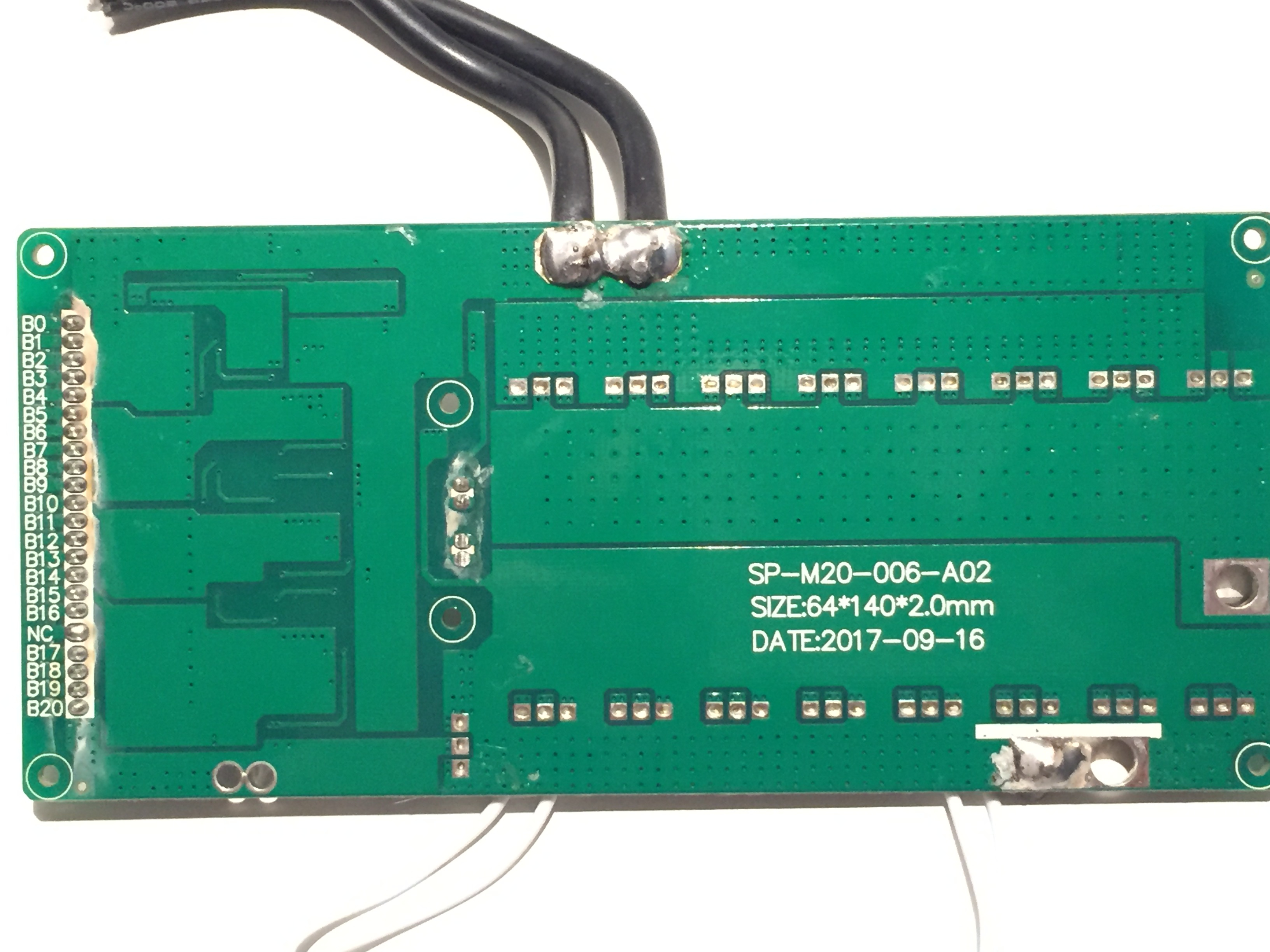 Das BMS ist recht einfach aufgebaut: zwei Reihen FETs, eine große Doppeldiode als Verpolungsschutz, 4 identische 20polige Chips und Kleinkram. Was mich gewundert hatte war die Zusammenschaltung der Chips und das Fehlen jeglicher DC-Wandler und Prozessoren, keine diskret aufgebaute Balancerschaltung. Überhaupt: ziemlich wenig Teile für ein 20S BMS.