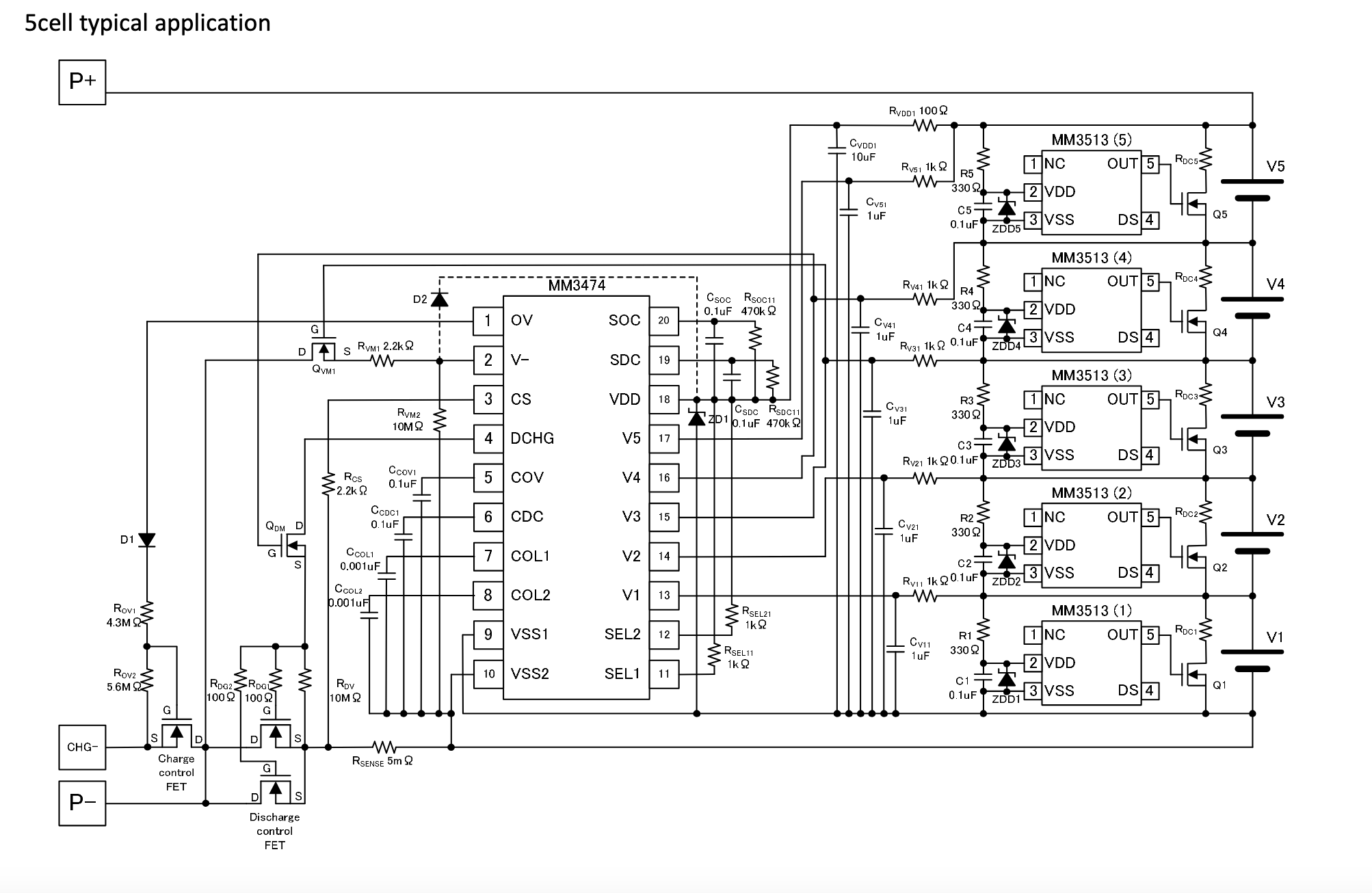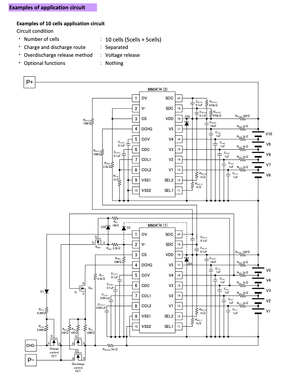 Die Beispielschaltung für 10S aus dem Datenblatt passt bis auf den Teil mit dem Chargeport 1:1 zum BMS. Die Platine sieht diesen immerhin optional vor.