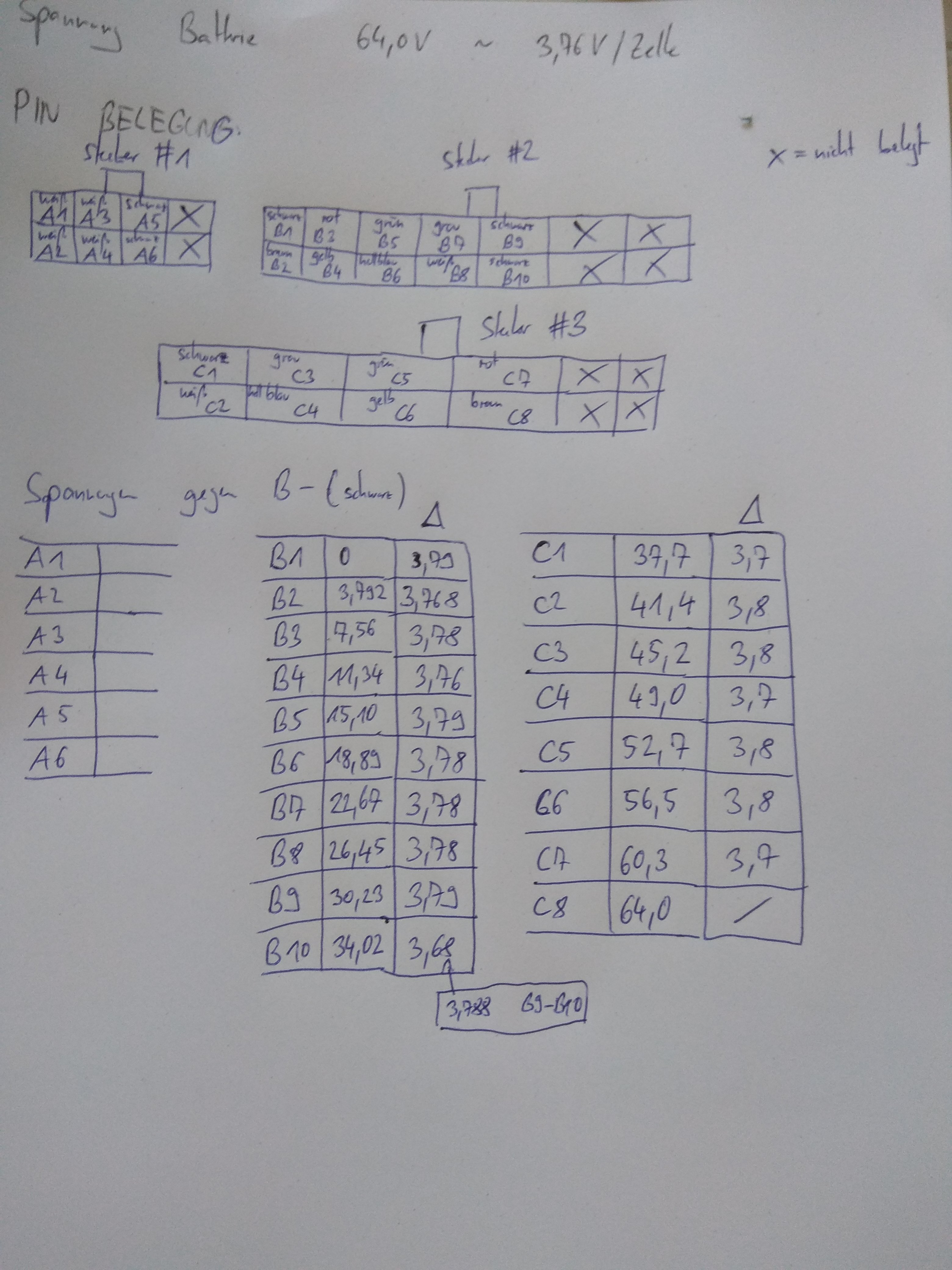 • Die Zellen sind alle ziemlich gleich, siehe Foto. Nur von B9-B10 PIN hatte es 0.1V angezeigt, dort hatte das Multimeter aber auch Messbereichswechsel und wenn ich die B9-B10 Spannung einzeln messe, dann passt es. Bis auf Messungenauigkeiten laufen meine Zellen also parallel und der Akku scheint in Ordnung zu sein! ;)