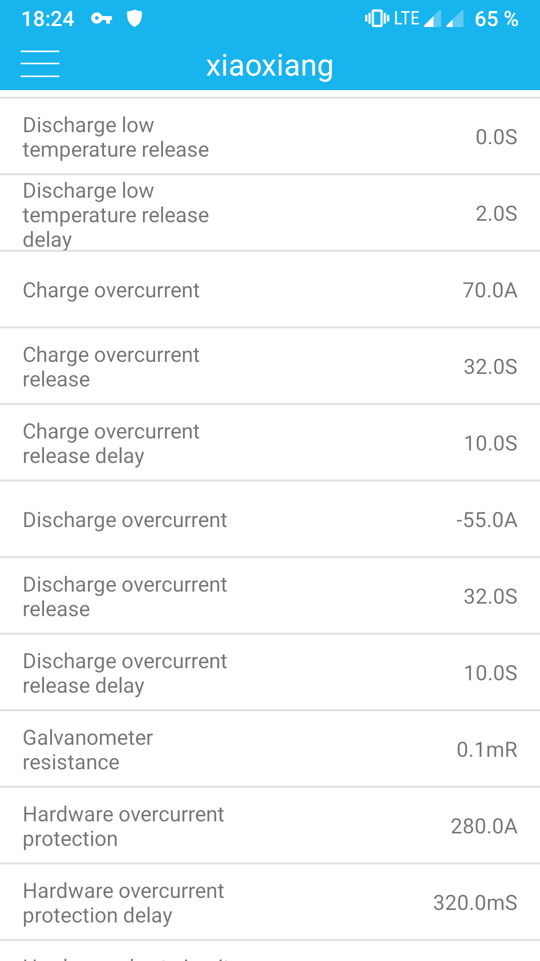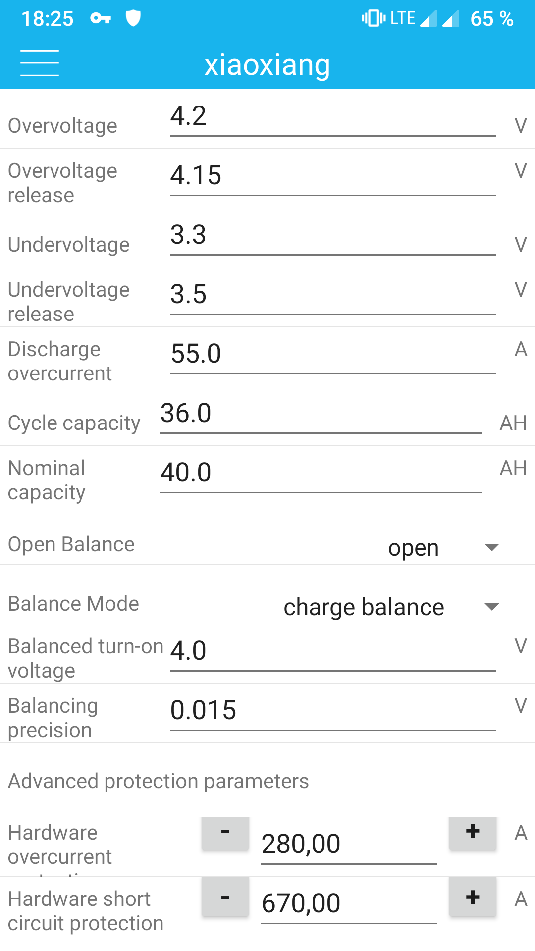 Leider kann ich das BMS nicht parametrisieren mit der App, laut meinem ebay Link oben gibt es aber Screenshots, das es gehen sollte? So kann ich nun nicht laden, weil ich nicht weiss, was an Cutoff Spannungen eingestellt ist (LiFePo oder LiPo).