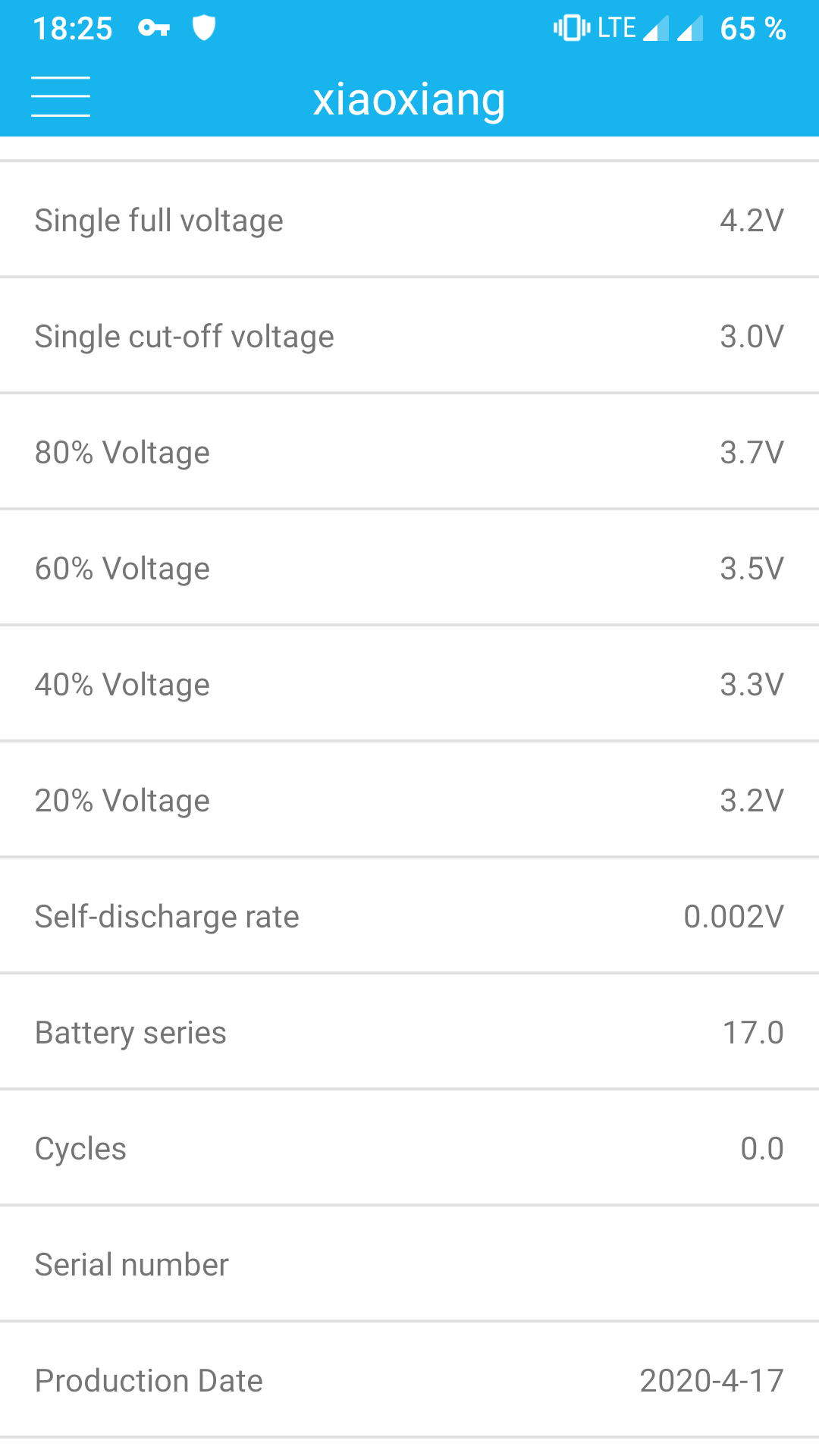 Die Xiaoxiang BMS Android App kann sich mit dem Bluetooth Modul verbinden und ich sehe die aktuelle Spannung (64V) und weiter nuetzliche Infos.