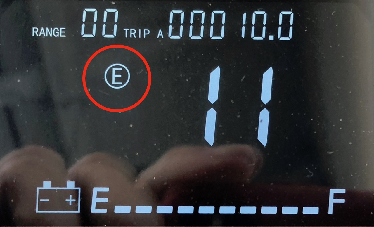 Für alle die vom "E" im Kreis gelesen haben, hier ein Bild von dieser Art Anzeige. Dabei blinkt das Batterie Symbol und das E (roter Kreis im Bild unten) gleichzeitig. Ladeanzeige ist bei null, sowie die Range.
