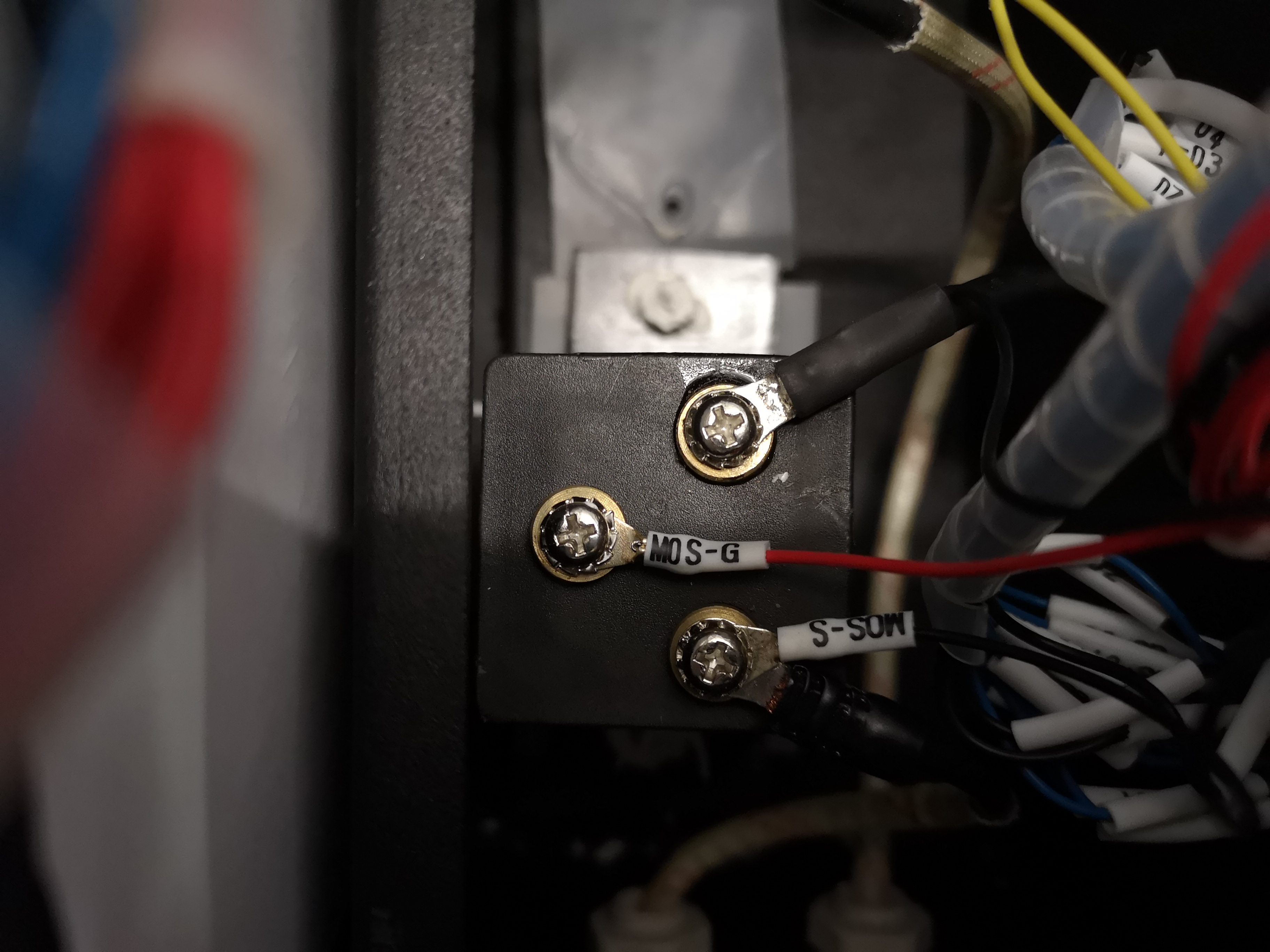 Es gibt ein Extrafach mit einer Art Verteilung. Der Pluspol läuft über einen Schütz, den Trinity unter Verdacht hatte. Der Schütz spricht bei 32 Volt (mehr gibt das Netzteil nicht her) schlapp an, scheint aber zu funktionieren.