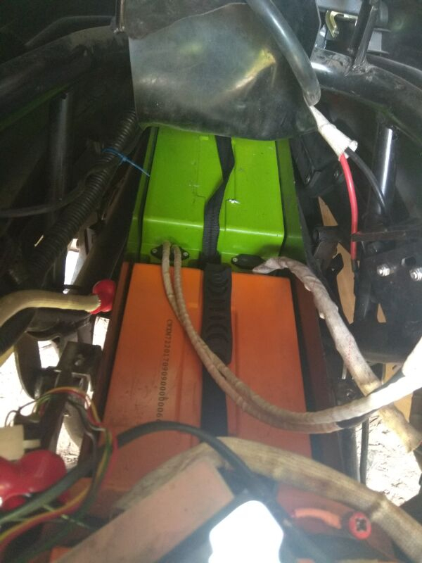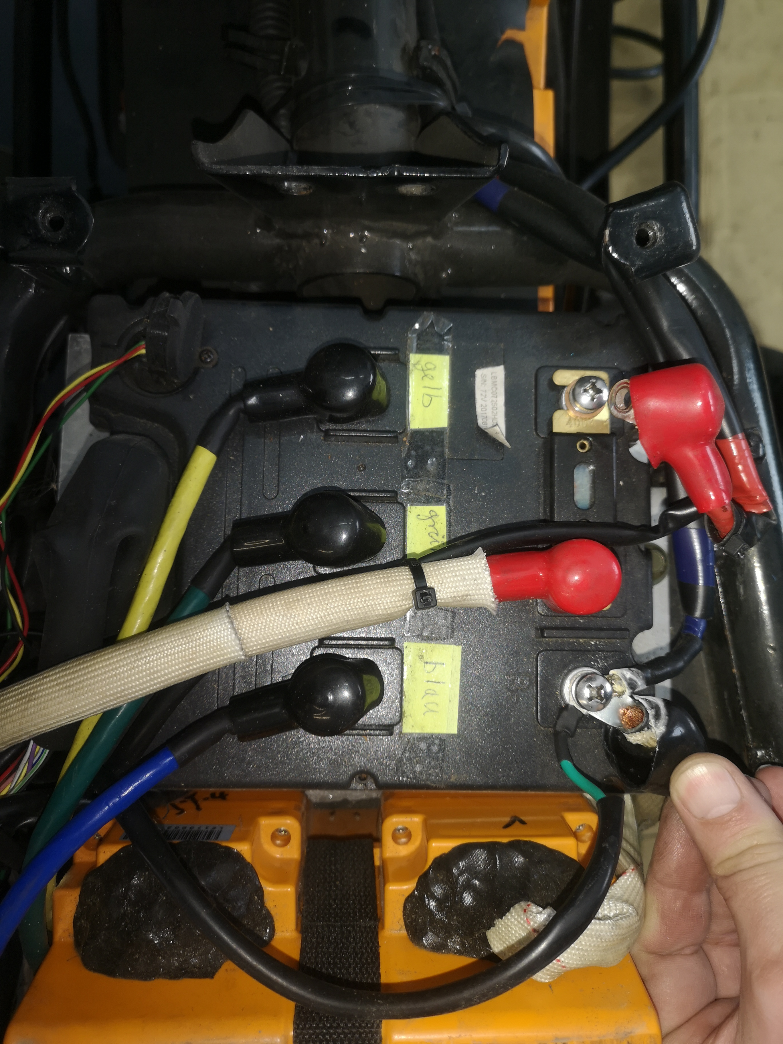 Vorne muss man ggfs. die steifen Kabel unter dem Rahmen etwas lösen und nach oben drücken. Den Controller konnte ich ohne Änderung der Kabel unter dem Fahrersitz unterbringen. Der Batteriekasten hat links und rechts außen Laschen mit einer Gewindebohrung. Da habe ich Gewindestangen reingedreht und und die Grundplatte des Controllers damit verschraubt. Zwischen Akku und Controller habe ich noch eine dicke Gummimatte zwischengelegt. Im vorderen Bereich musste ich das Helmfach etwas aufschneiden. Die Öffnung habe ich erstmal mit einer Gummimatte abgedeckt. Da muss aber noch eine Hardware-Lösung her....