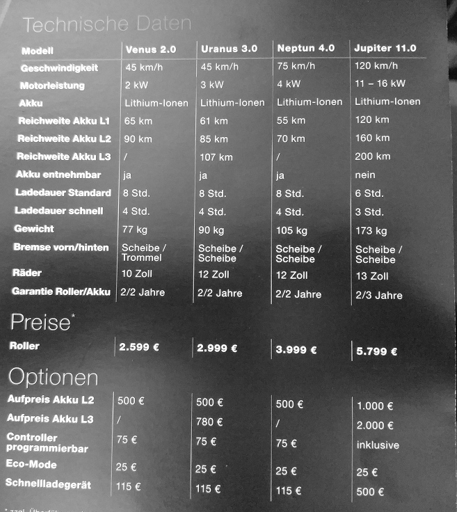Noch eine Frage, ich häng jetzt mal den Flyer an, den ich von Trinity hab, da sind zwei Akkutypen aufgeführt, L1 und L2. Mein Verständnis ist jetzt, dass man zwei L1-Akkus in den Roller stecken kann, aber nur einen L2. So hab ich den Händler verstanden, er hatte leider keinen Neptun da, den ich mir hätte anschauen können, nur den Uranus. Stimmt das, oder kann man zwei L2-Akkus reinstecken? Oder bedeutet die 2 in L2, dass das schon zwei Akkus sind?