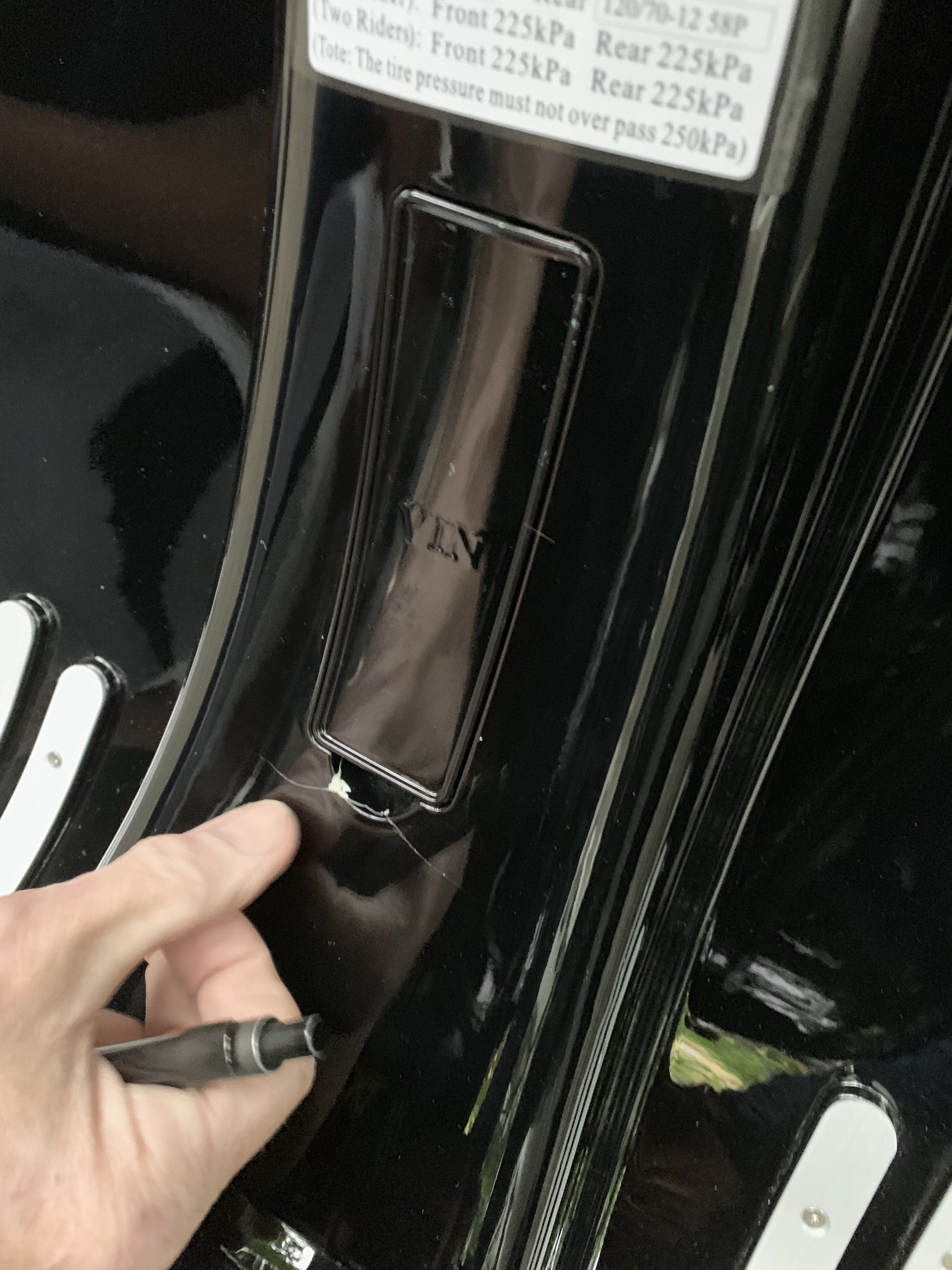 3. Der Fahrer hat beim reindrücken der Abdeckung für die Fahrgestellnummer einen Riss in die Karosserie gezaubert - er war selbst recht traurig darüber - aber was meint Ihr - kann ich dafür einen Nachlass verlangen. Der Riss ist deutlich und geht nach Links nach Rechts in beide Richtungen - der Lack ist auch abgeplatzt. (Siehe Bild)