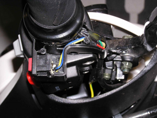 Die Kabel vom Gasgriff steckten normal an der Leitung, daher öffnete ich die Abdeckung zum I/II Schalter (Modi-Schalter). Dort war der Fehler: grüne Korrission am Metall-Band, dass die Gas-Stärke übernimmt. Mit Reinigungsspray war dass dann gelöst und ich werde den Rat meines Freundes bald ausführen und den Bereich mit Silikon-Fett gegen Feuchtigkeit (es regnet ja dort mehr oder weniger einfach rein) abschirmen.