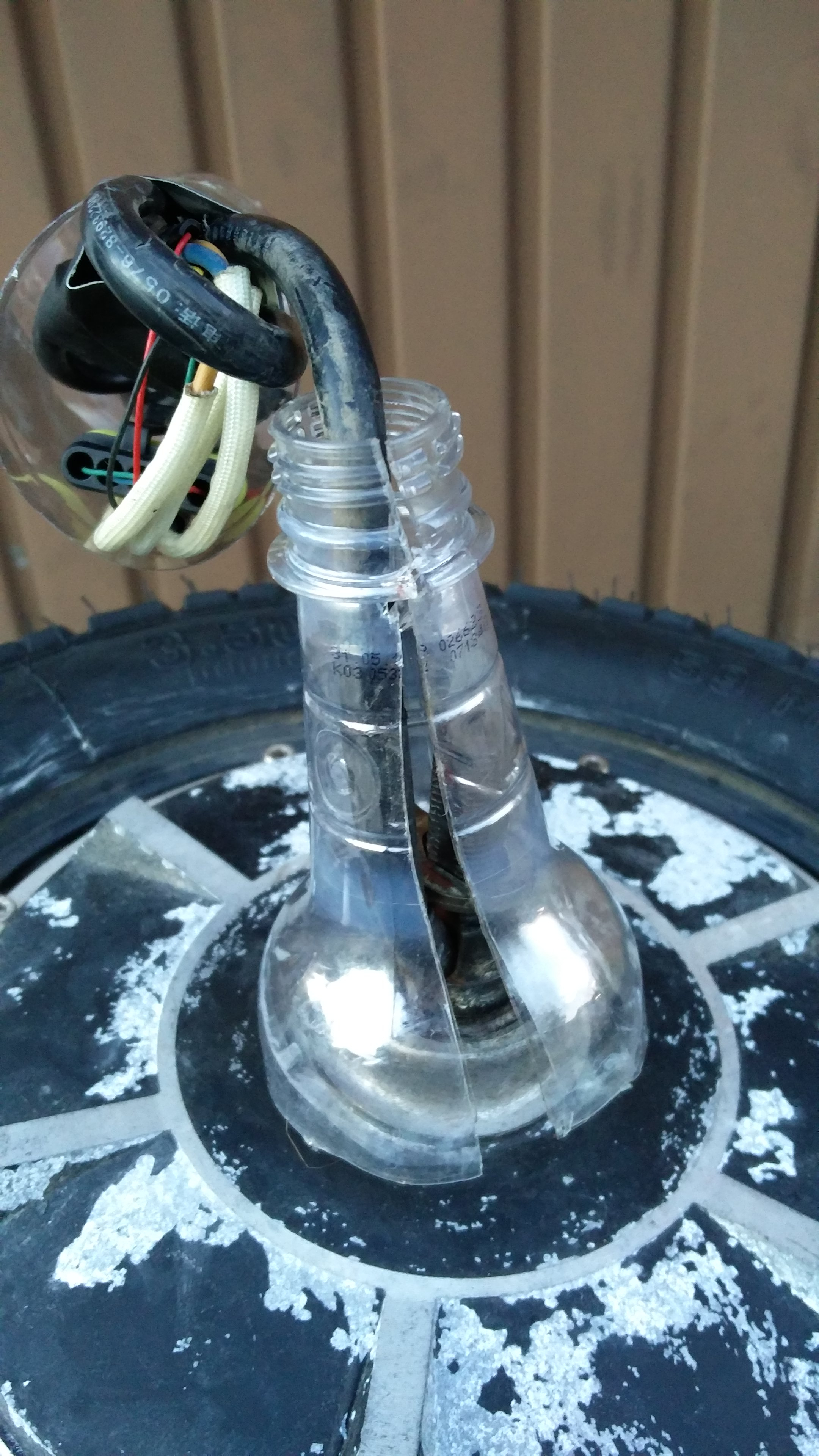 Den Motor komplett auf eine Fussbank geschraubt, Achse und Kabel passen durch das Griffloch