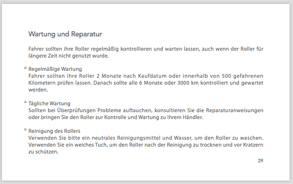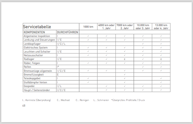 Außerdem hab ich in der Bedienungsanleitung, die ich von KSR per Mail bekommen habe, gelesen, dass der NIU bei 1000km und dann jährlich oder alle 3000km zur Inspektion muss.