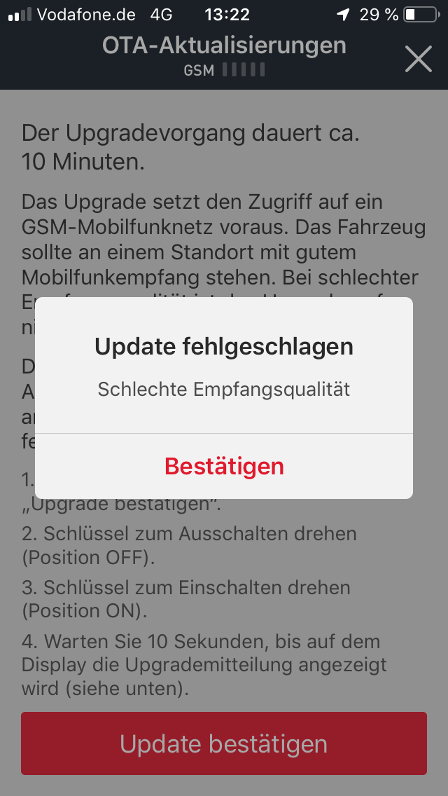 Da das ein sehr seltener Fehler ist und sich viele Händler mit der Thematik noch nicht so vertraut sind, mußt Du das beim Händler reklamieren, wahrscheinlich mit Nachdruck und auch darauf bestehen, das der Importeur (die KSR-Group) davon erfährt. Nur die können eine Überprüfung von Vodafone erzwingen, ob Deine eSIM in der ECU für den Datenverkehr freigeschaltet ist.