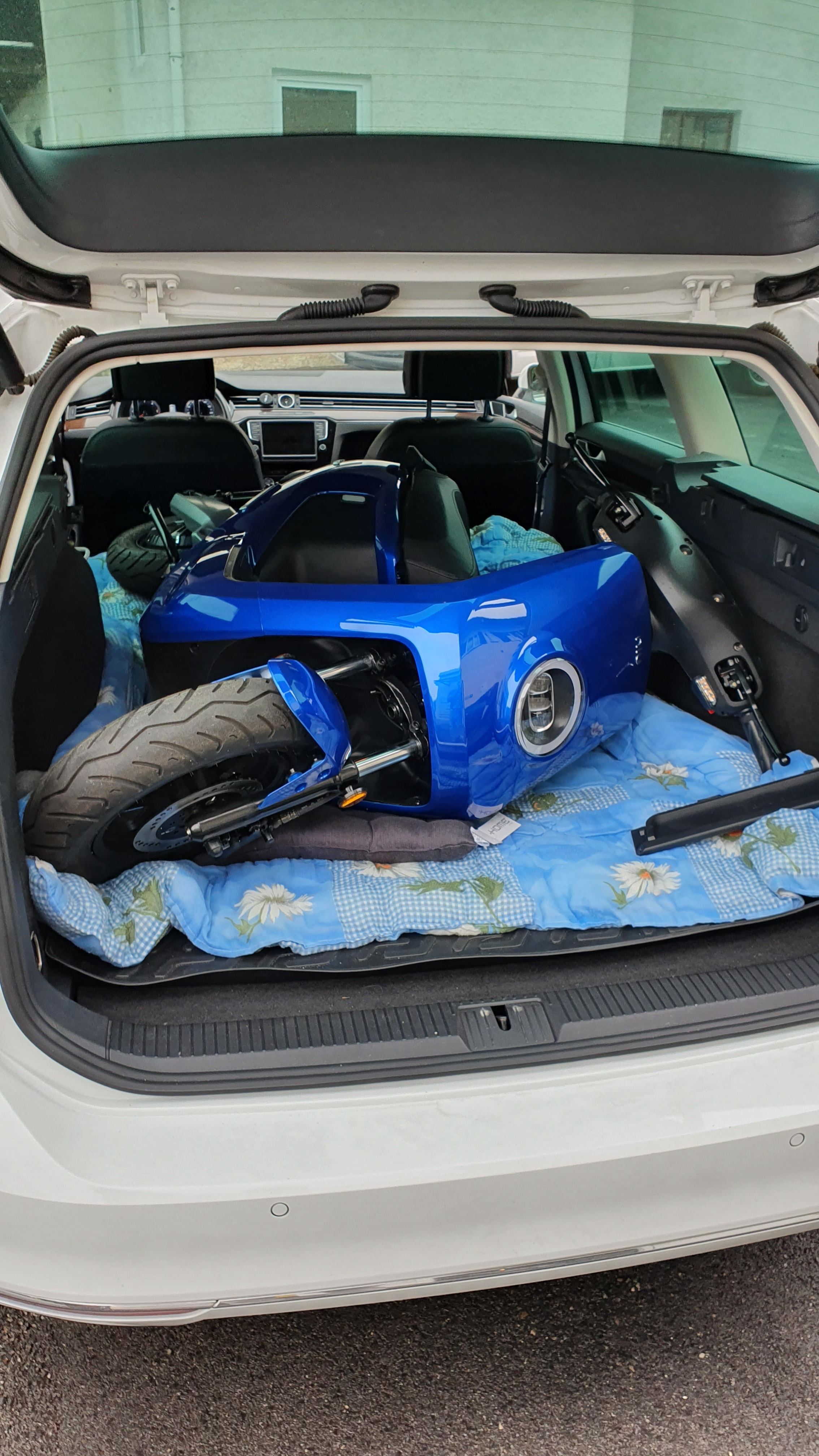 Ich habe meinen N1S mit den VW Caddy meiner Schwester abgeholt. Wenn man Spiegel und Frontschild abschraubt passt er stehend hinein (ca. 1 cm „Luft“ oben). Die Rücksitze habe ich ausgebaut. Das 12" Vorderrad passt in den Fußraum der Rücksitze, damit das Beinschild vorne nicht an den Beifahrersitz kratzt, habe ich eine Decke dazwischen gelegt. Da der NIU dann am Boden leicht aufsitzt, kann man ihm gut mit Gurten in den Halteösen des Caddy aufrecht befestigen. Als Rampe diente mir ein Schalbrett, was beim Bau unseres Hauses übrig blieb. Der Fahrakku konnte im Roller verbleiben. Die Heckklappe konnte vollständig geschlossen werden. So ging es dann ca. 120km über die Autobahn - ohne Probleme.