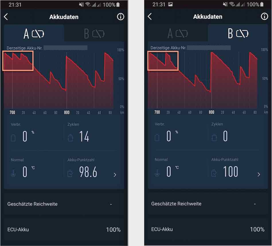 -Die Akkuanzeige in der App zeigt mir immer an, dass Akku B ca. 5 % schneller entladen ist, als Akku A. Das passiert manchmal, aber nicht immer. Wenn man die beiden Graphen der Akkustände vergleicht sieht man auch, dass Akku A "Sprünge" hat, B aber nicht (Foto kommt später).