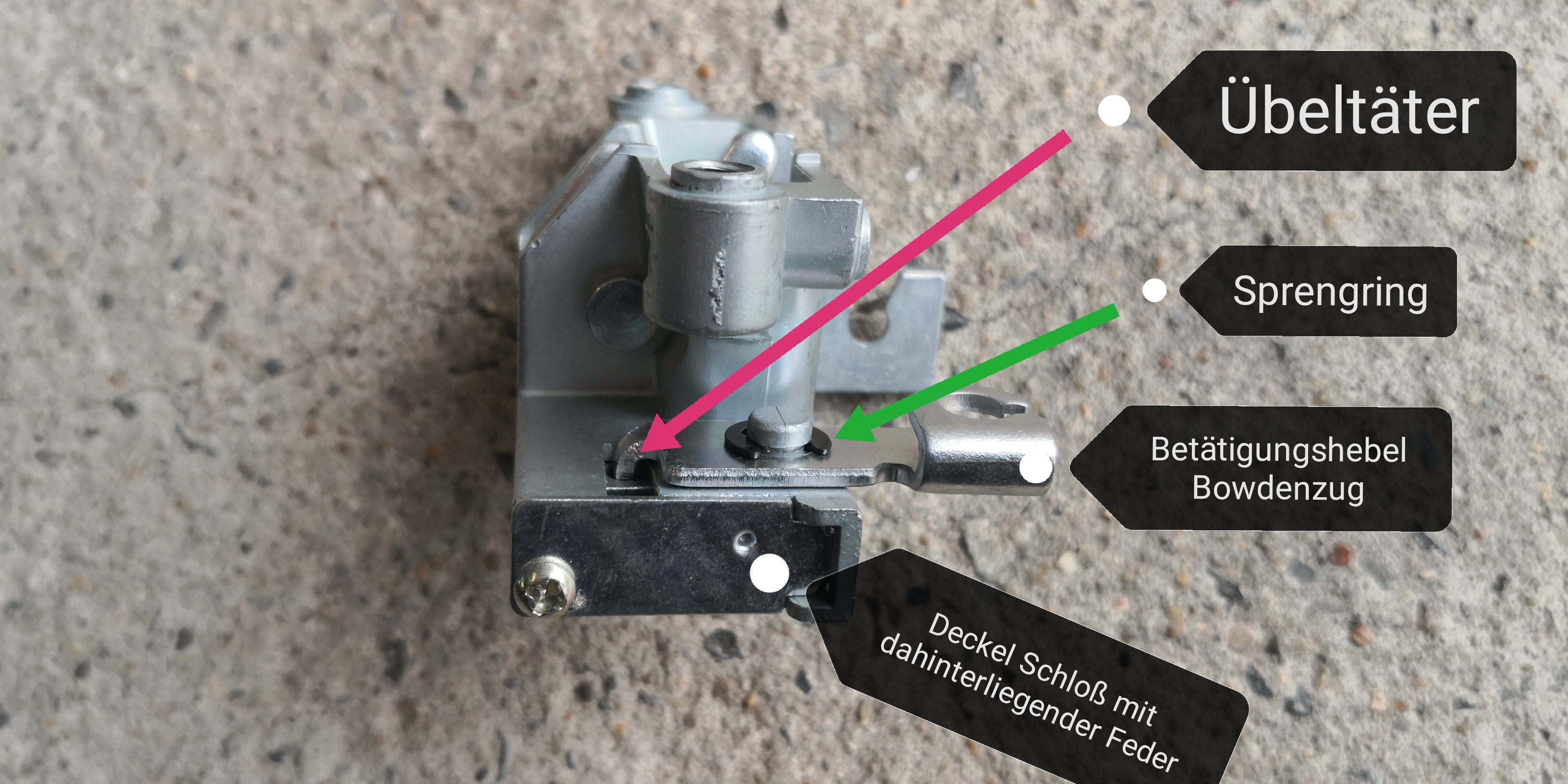 Ich habe den Deckel vom Schloß mit der Mini-Kreuzschlitz auch aufgehabt, weil ich selbst ja hier nicht nach Anleitung arbeite, sonder das eigenständig rausgefunden habe. Also dahinter ist eine Feder ähnlich wie im Kugelschreiber und ein Metallteil, wo der Betätigungshebel für den Bowdenzug drin läuft, man kann kurz gucken ob da Fremdpartikel drin sind, dann säubern.