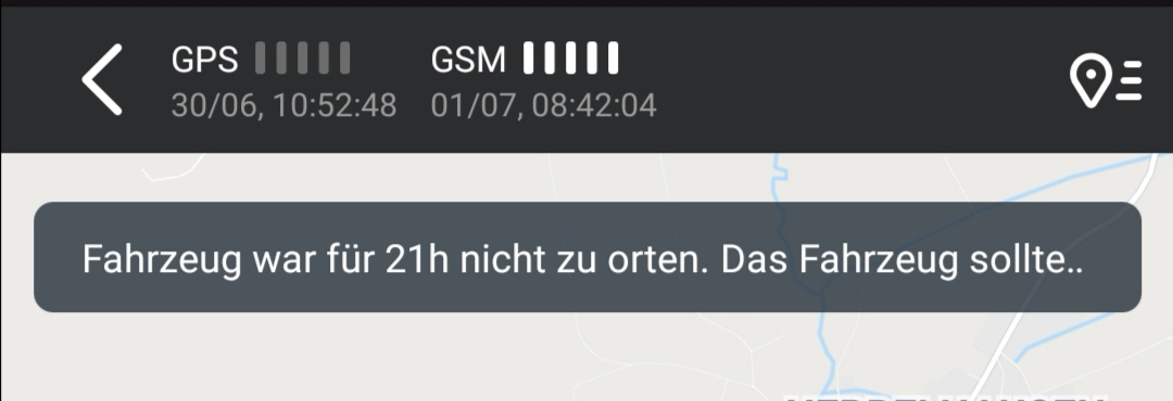 Allerdings zeigt er auf der Karte in der App, dass er seit gestern die Position nicht mehr kennt und da wird auch kein Ausschlag der GPS-Anzeige in der Kartenansicht angezeigt. Die Anzeige-Balken sind nicht gefüllt.