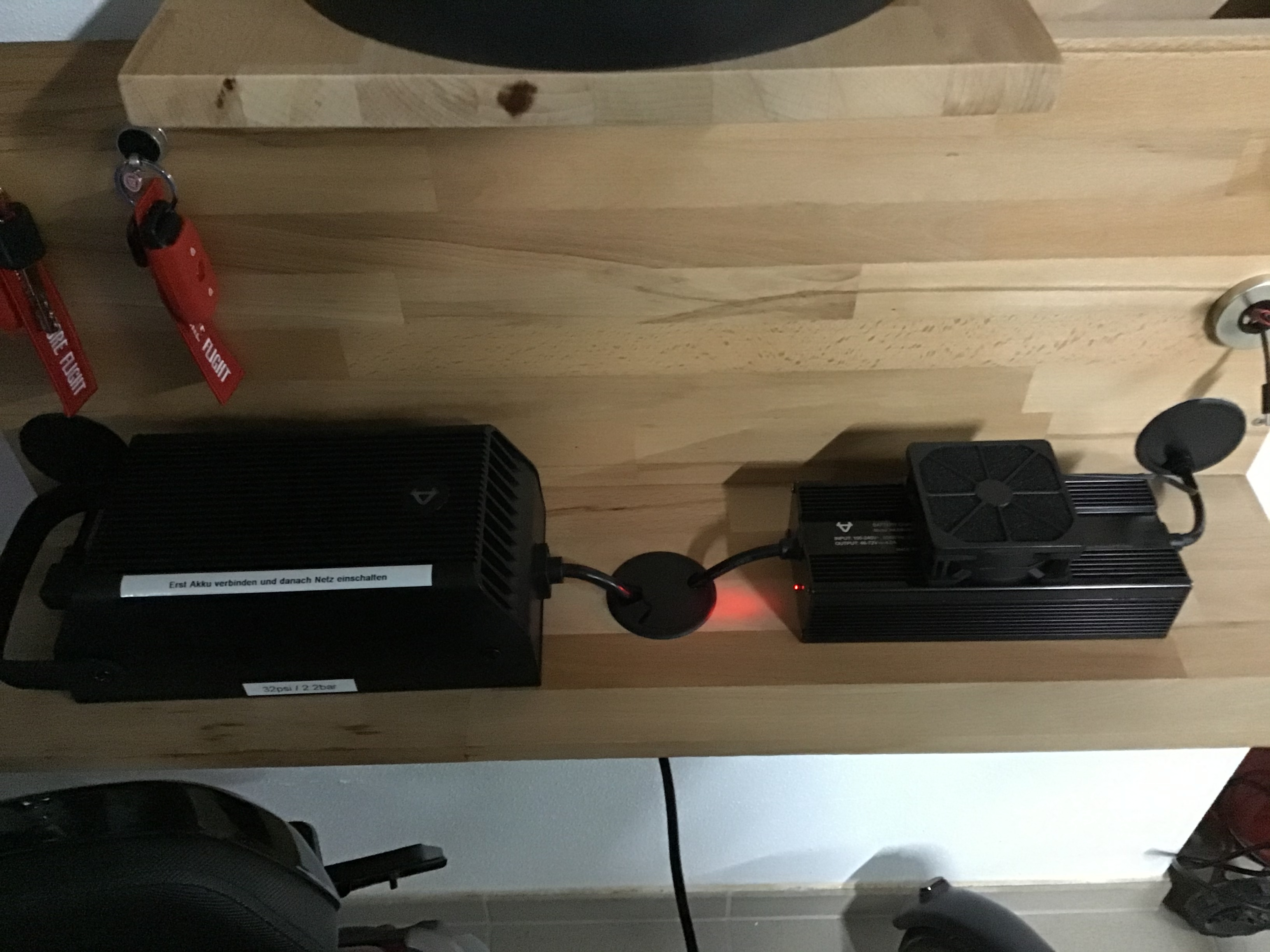 Guten Abend, ich habe auch von elmo das kleine Ladegerät nachgekauft, habe es aber stationär am Ladeplatz in der Garage und mit einem PC Lüfter versehen damit es nicht zu heiss wird wenn es von 20% auf 100% fast 12Stunden laut Anzeige am Roller lädt.