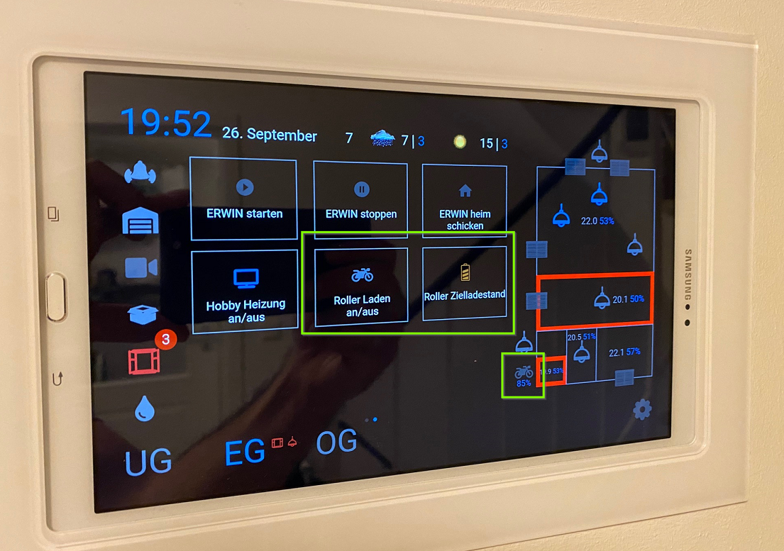 - Der Ladestand, die Steuerung und eine Auswahlmöglichkeit für den Zielladestand (80% oder 100%) lässt sich über das Smarthome-Steuerungs-Tablet in den Fluren steuern (siehe Bild)