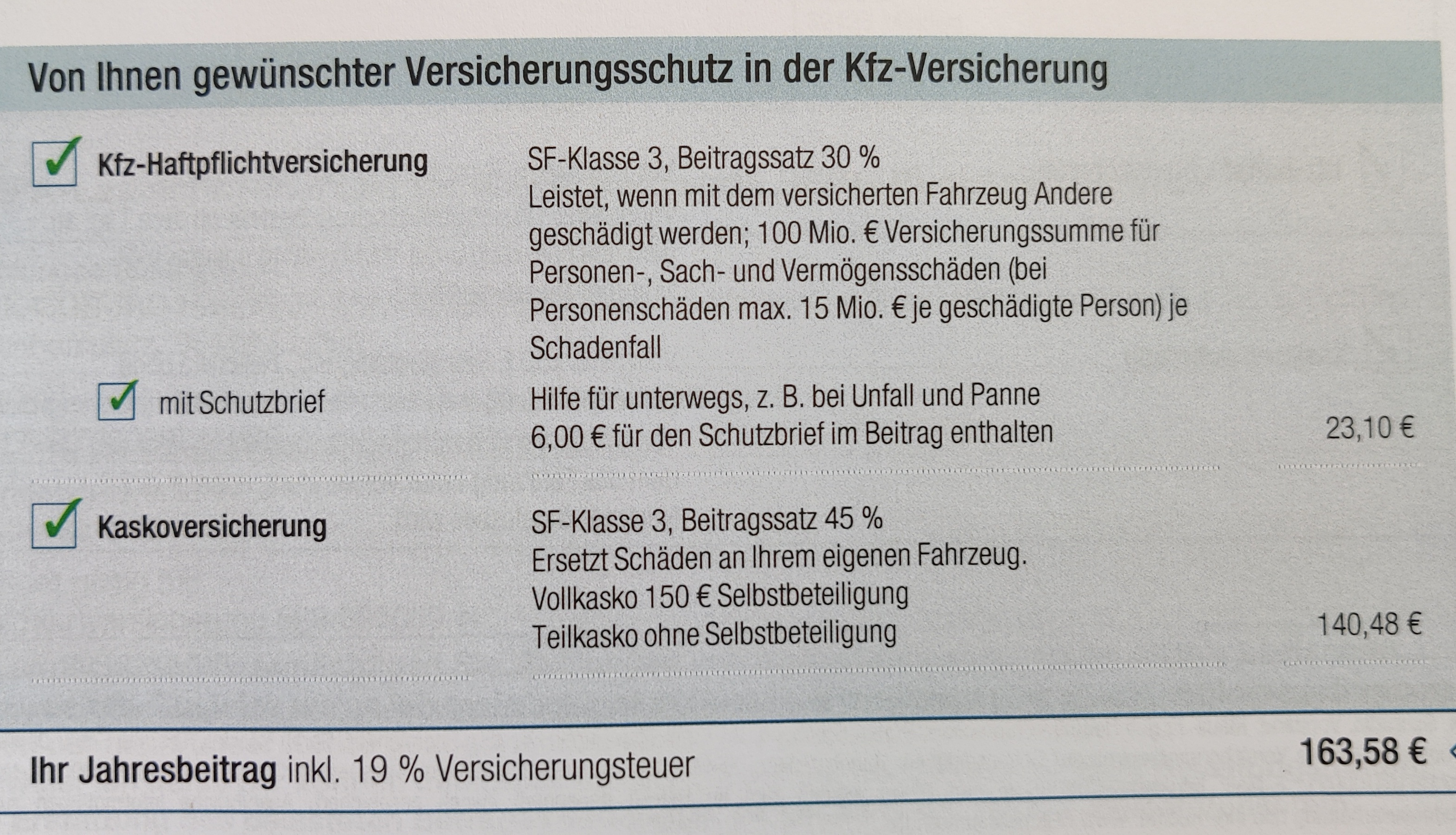 Ich zahle mit Haftpflicht und Teilkasko (150€ SB) und SF4 knapp 120€