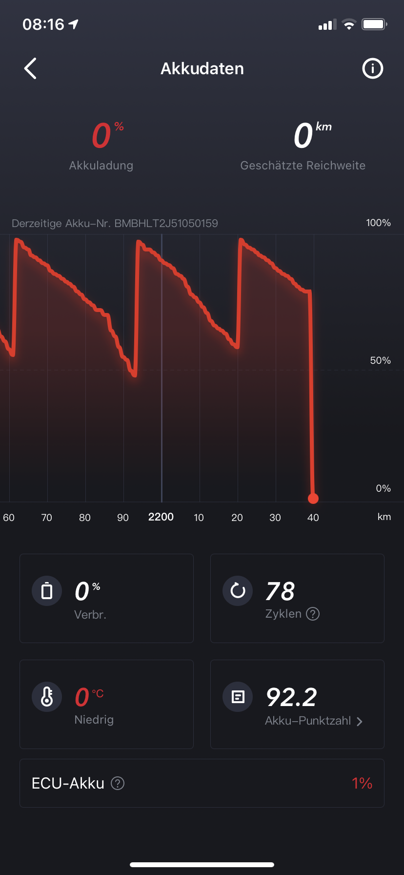 Sicher, das dein ECU Akku leer ist? machst du das vom 1% abhängig?iphoner2804 hat geschrieben: ↑Mi 24. Mär 2021, 08:20Mein ECU-Acku hat nur 1% und habe seit mindestens 2 Tage kein GPS mehr. Roller fährt aber noch. Ich bin der Meinung es liegt ein Problem mit der ECU vor oder der Backup-Acku lädt nicht mehr. Ich werde meinen Händler informieren. Habe noch bis Mai Garantie. Eine Cloud-Störung oder Arbeiten am Service durch Meldungen im Forum kann ich nicht sichten. NIU selber meint kein Fernzugriff . Liegt also an dem Acku in der ECU.