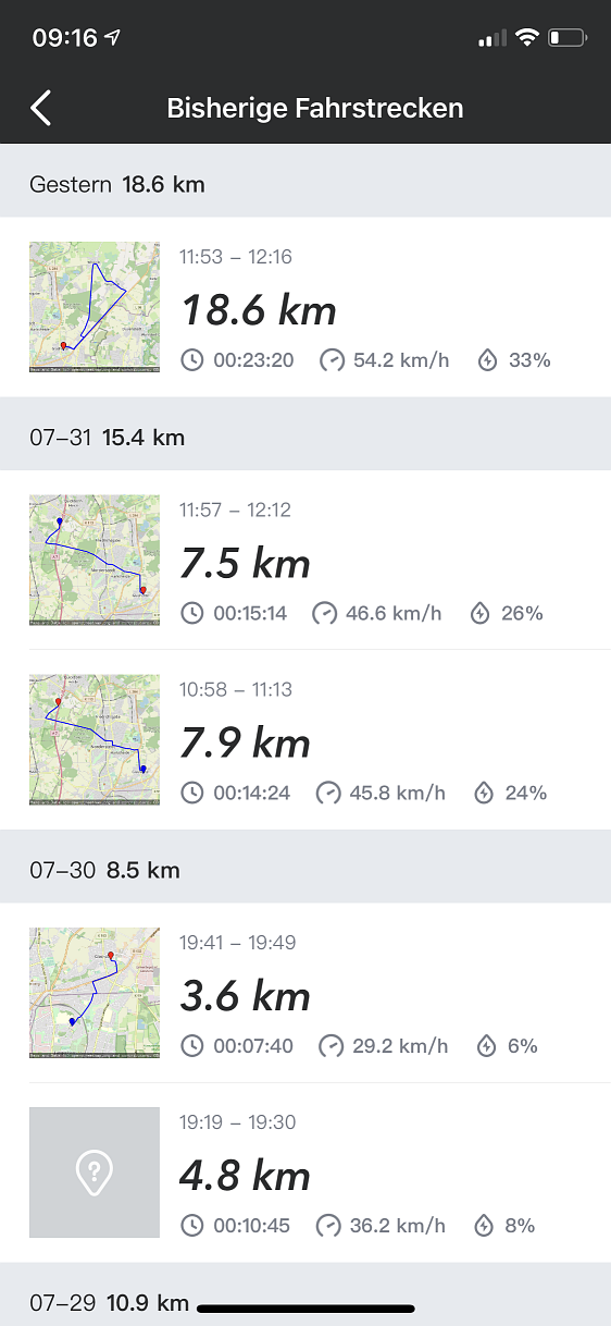 Auch ein Verbrauch von 25% für die Strecke spricht gegen die 7,5km - dann würde eine Ladung ja nur für 60km reichen (normalerweise spricht der NIU von 96km Reichweite, wenn die Batterien zu 100% geladen sind).