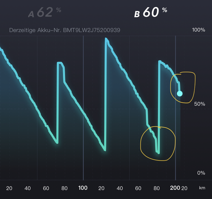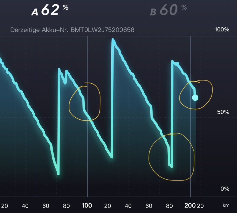Das Thema ist auch schon von allen anderen NIUs bekannt. Das BMS ermittelt auch die Akkutemperatur und kalkuliert die in die Prozentanzeige ein. Mein Roller wird morgens mit warmen frisch geladenen Akkus genutzt, und zumeist komme ich mit 62 - 68% Akkustand und 30° Akkutemperatur auf der Arbeit an. In den zumeist 10 Stunden Standzeit dort sackt mir die Anzeige im Sommer um vielleicht 3%, bei kalten Temperaturen auch mal um 15% weg, gerade wenn die Akkutemperaturen von 30° auf einstellig fallen. Man kann das recht gut über die App nachverfolgen, wenn man mal alle zwei Stunden Akkutemperatur und "Ladestand" abgleicht.