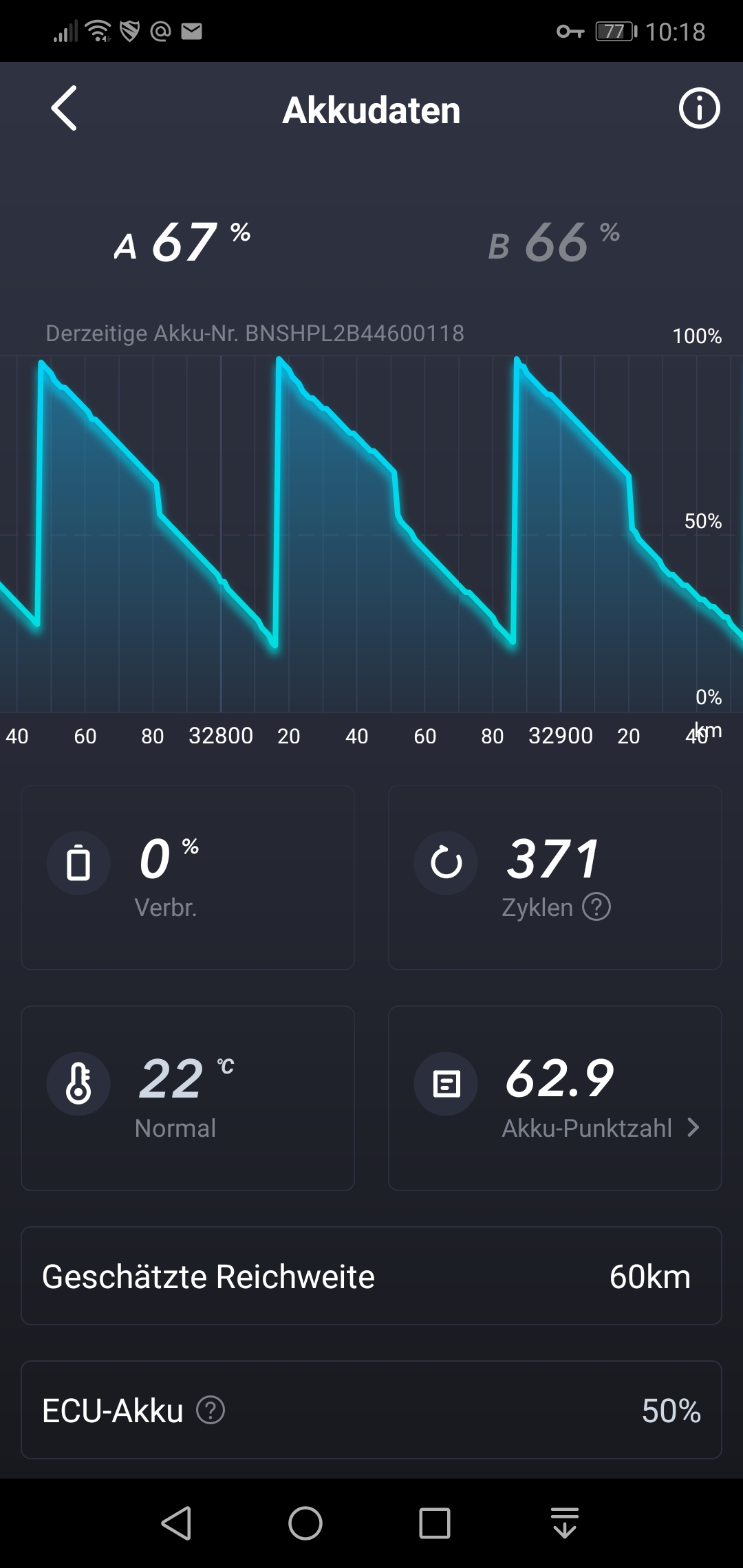 nach 23km stelle nach sehr sparsamer Fahrt den Roller mit 80% ab, fahre mit 76 wieder los. habe auch Tage, da komme ich mit 78% an und fahre mit 76% los. die 75-76% habe ich fast immer, wenn ich wieder losfahre. Egal wie vorsichtig ich vorher gefahren bin und der Akku augenscheinlich noch voller als durchschnittlich ist.