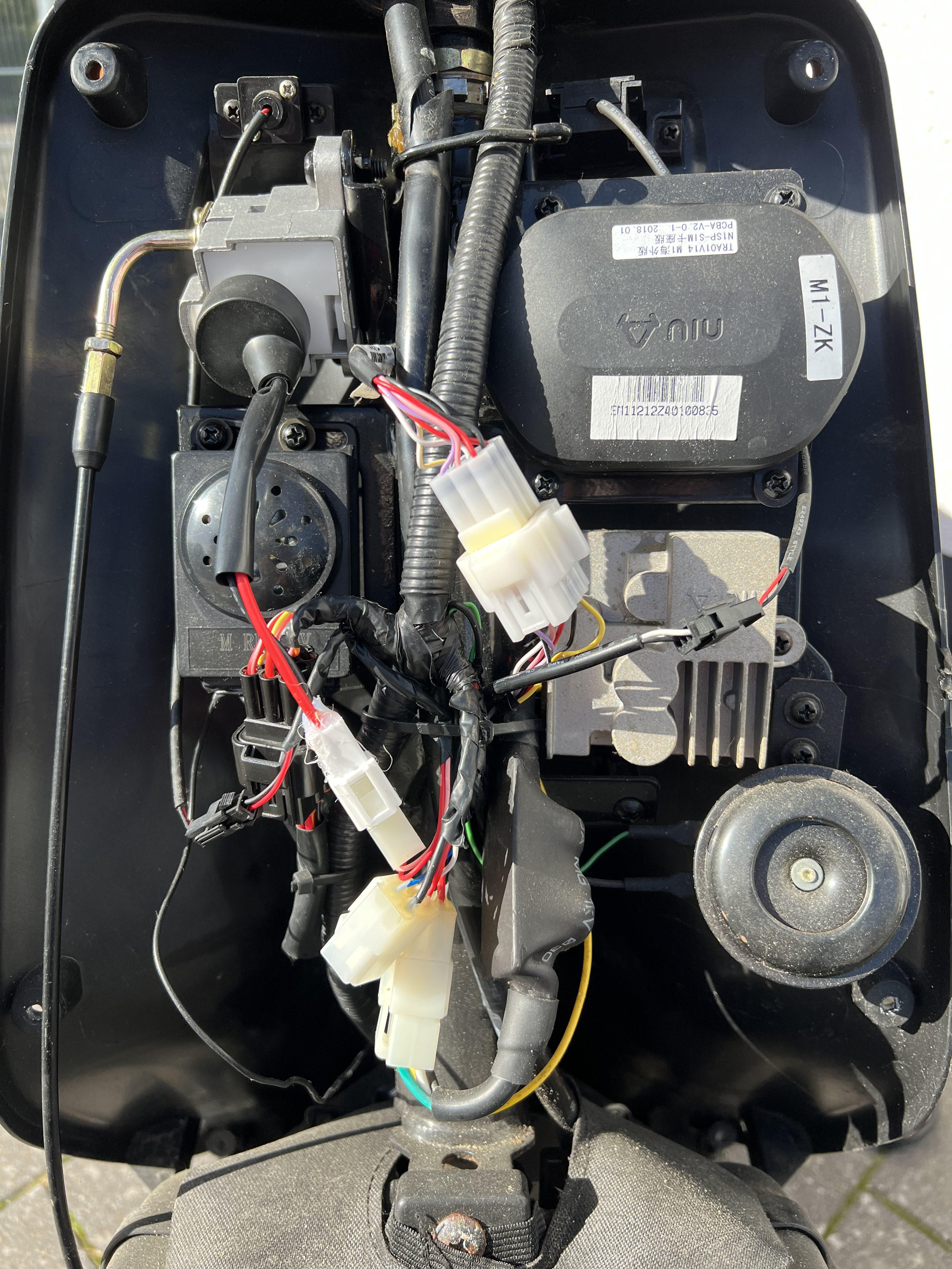 Wir haben testweise mal jeweils einzeln die Stecker abgezogen, danach war der Roller entweder komplett tot, oder das Kombiinstrument hat zwar Strom bekommen, aber nichts mehr angezeigt. Also leider kein Erfolg.