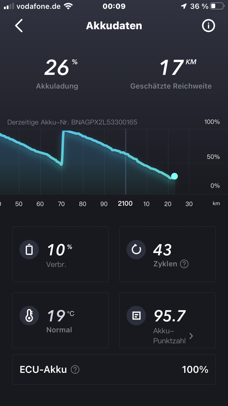 Unb bei mir sind es 36 km mit 14 % Restakku. Hochgerechnet sind das 42/43 km.