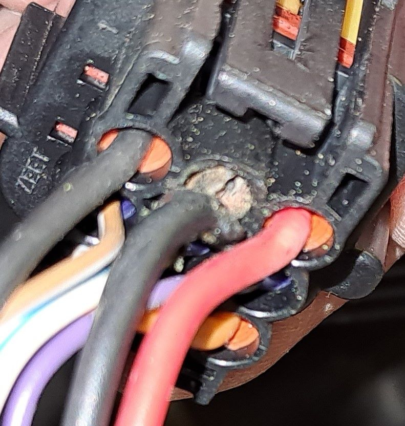 So ein Kontakt im Stecker kann schon bei der Montage leicht verrutscht sein. Oder dem Arbeiter sind ein paar Schweißtropfen reingelaufen, denn die anderen Kontakte sehen meiner Meinung nach auch nicht gut aus. Defekte Feuchtigkeitsabdichtung, einmal nach Streusalzinsatz auf der Straße, und es sieht ähnlich aus.