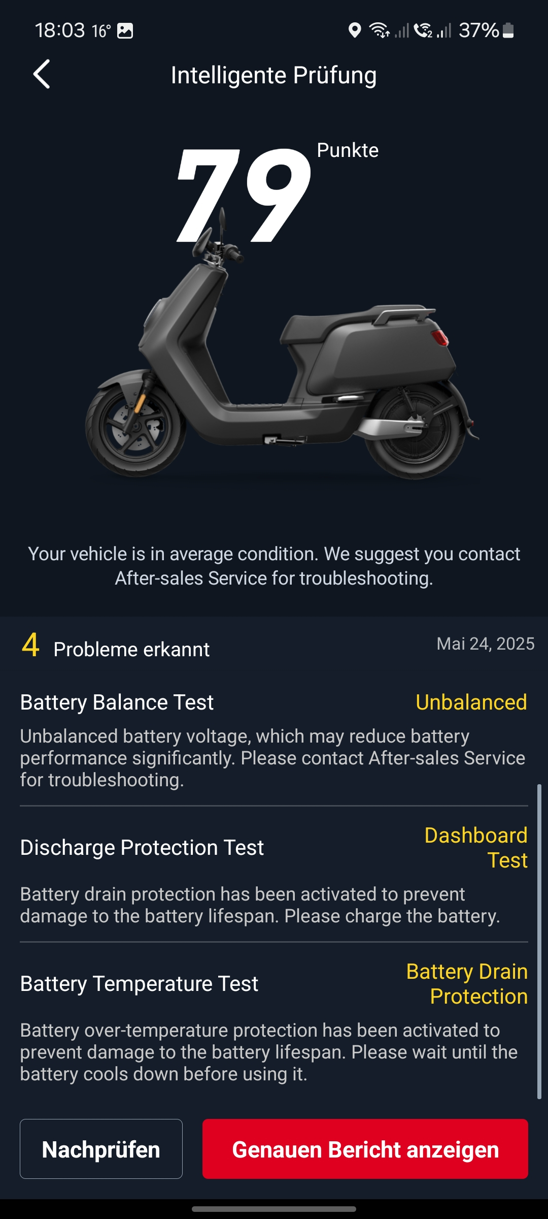 Der Roller muss übrigens dringend zur Inspektion, und andere, wenn auch kleinere Reps stehen aus. Zudem sind die Reifen recht runter. Also die Übelegung, ob nicht gleich nach 7 Jahren ein neuer Niu. Aber vorher würde ich doch gerne wissen wollen, was denn nun kaputt sein könnte und was eine Rep kosten würde. Der Akku erfreut sich übrigens bester Gesundheit.