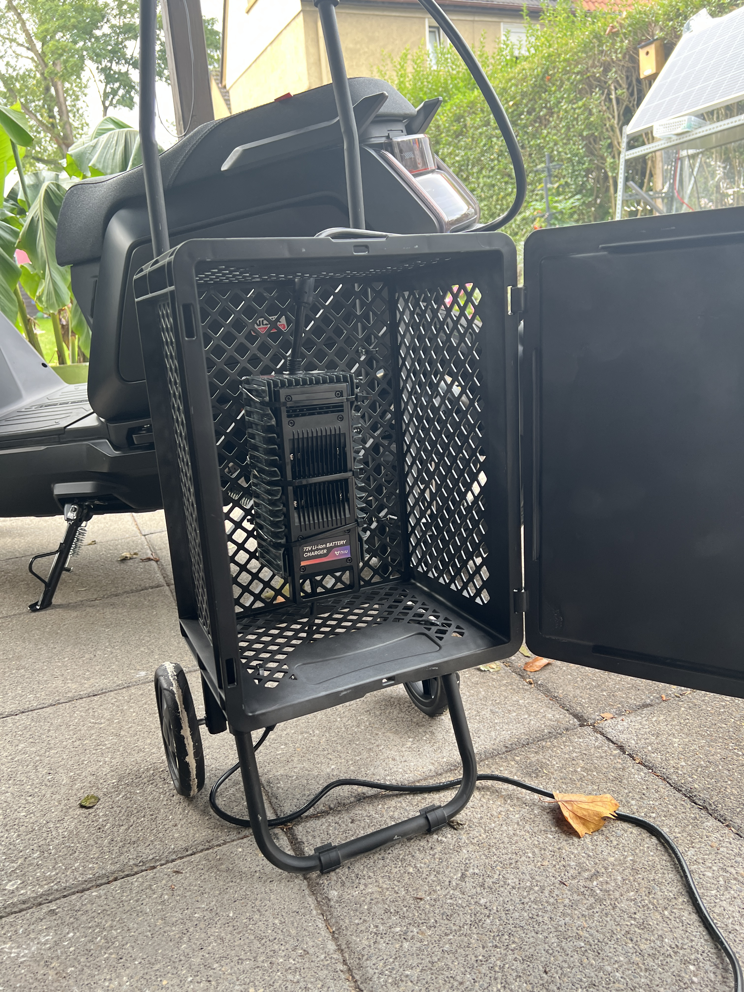 ich lade den Roller z.B. im Carport. Somit ist ein lose rumfliegendes Ladegerät von der Strasse auch leicht als solches zu identifizieren. Abgesehen davon, das handling ist auch umständlich. Die Tage dann Sperrmüll, der Hackenporsche beim Nachbarn und ne Idee. Kiste, Deckel und Kabelbinder im Kellerfundus zusammengesucht. tadaa, der Ladecarry. mobil und praktisch, zumindest für meinen Anwendungsfall.