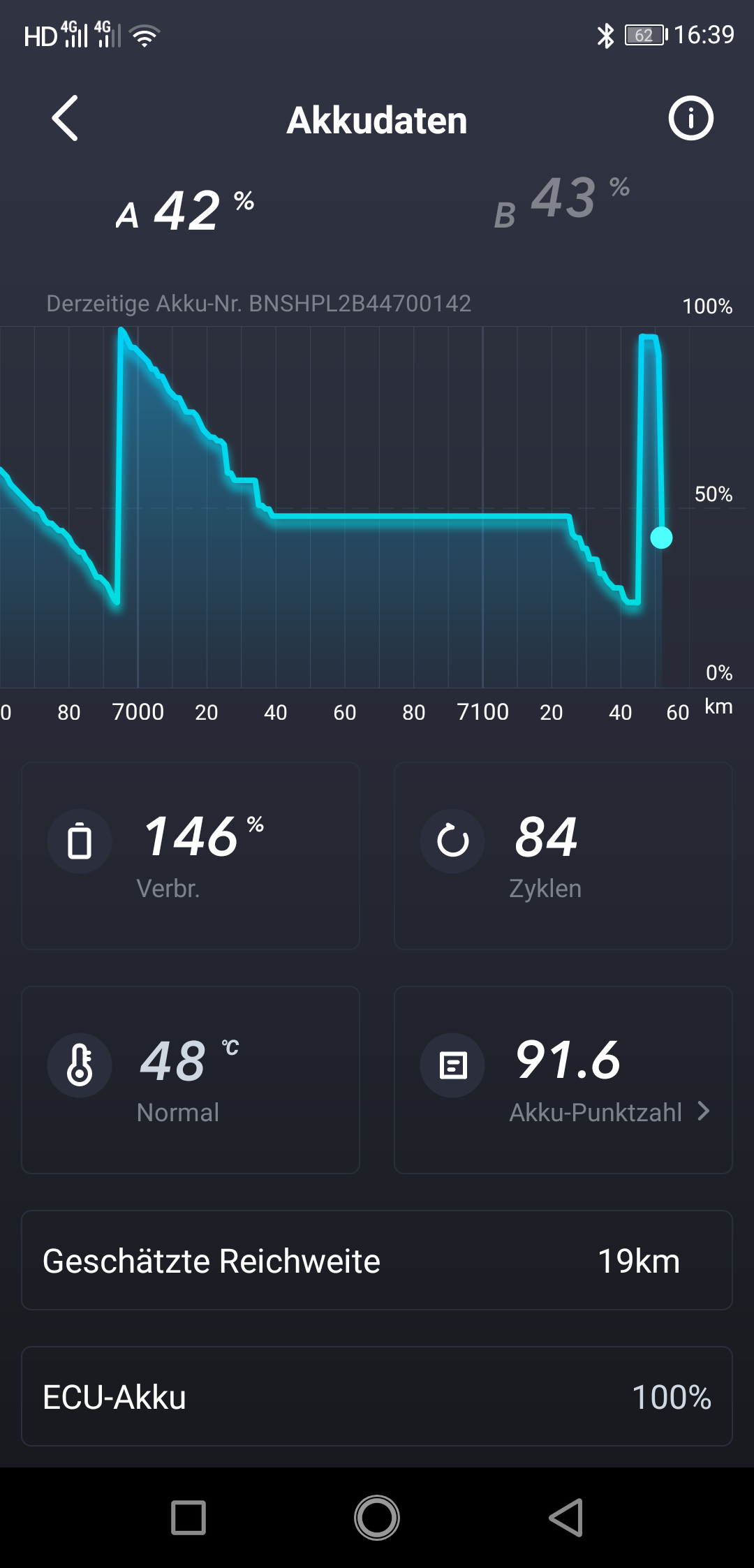 Davon unbenommen ist die Reichweitenanzeige und deren Auffälligkeiten. Gerade nach dem Einsetzen der Akkus wird oftmals nur die halbe Reichweite über Stunden angezeigt. Die Cloudsoftware kommt mit den Rollern mit 2 Akkus nicht gut klar.