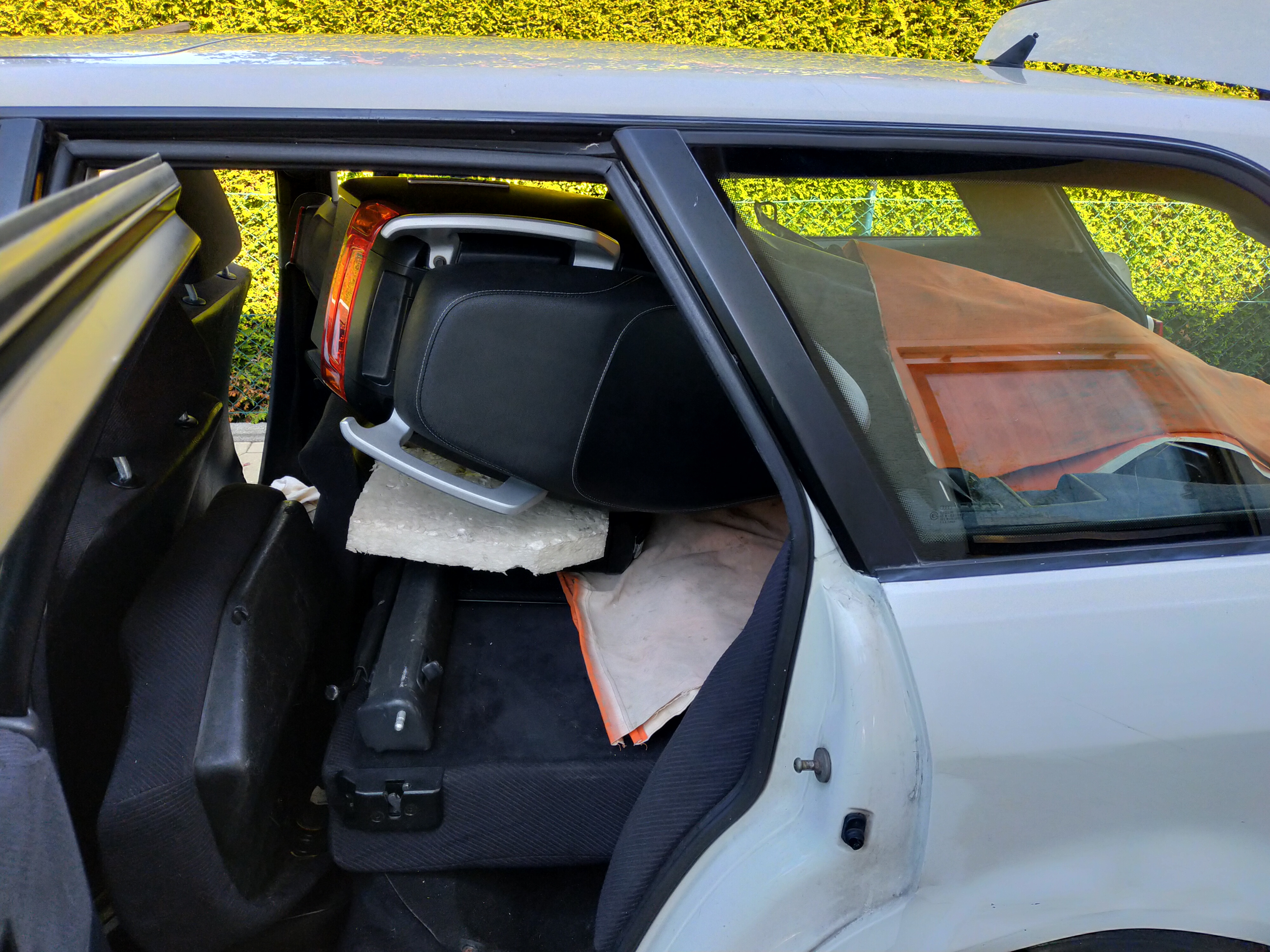 Aber das gute BOS* Trenngitter-Rollo nicht oben hinter den Vordersitz eingehängt??? Ist fein säuberlich in seiner Kassette an der Kante der Rücksitzlehne aufgerollt und streckt seinen Kraftlimiter-Haken arbeitslos nach oben