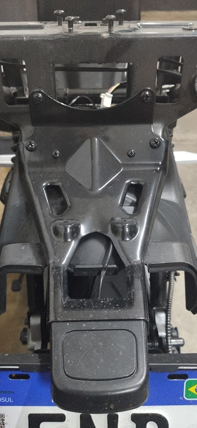 Ich vermute, dass die NGTS-Platte und die Lampenhalterung auch den hinteren Kotflügel (innerhalb der Motorradverkleidung) tragen. In diesem Fall muss es ein anderes internes Teil geben, das an dieser Stelle anwendbar ist, um diesen Kotflügel zu halten. Eine andere Sache: hier in Brasilien trifft das Brett trotz dieser schrecklichen Unterstützung manchmal die Kotflügel , die an der Waage hängen bleiben, das Schild im ersten Loch, an dem Sie auf der Straße vorbeikommen.