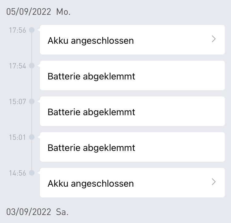 Kurz bevor er in der Nacht um ca 2 Uhr off ging , bekam ich von der App noch Mitteilungen am Nachmittag das die Batterie mehrmals abgeklemmt worden sei.