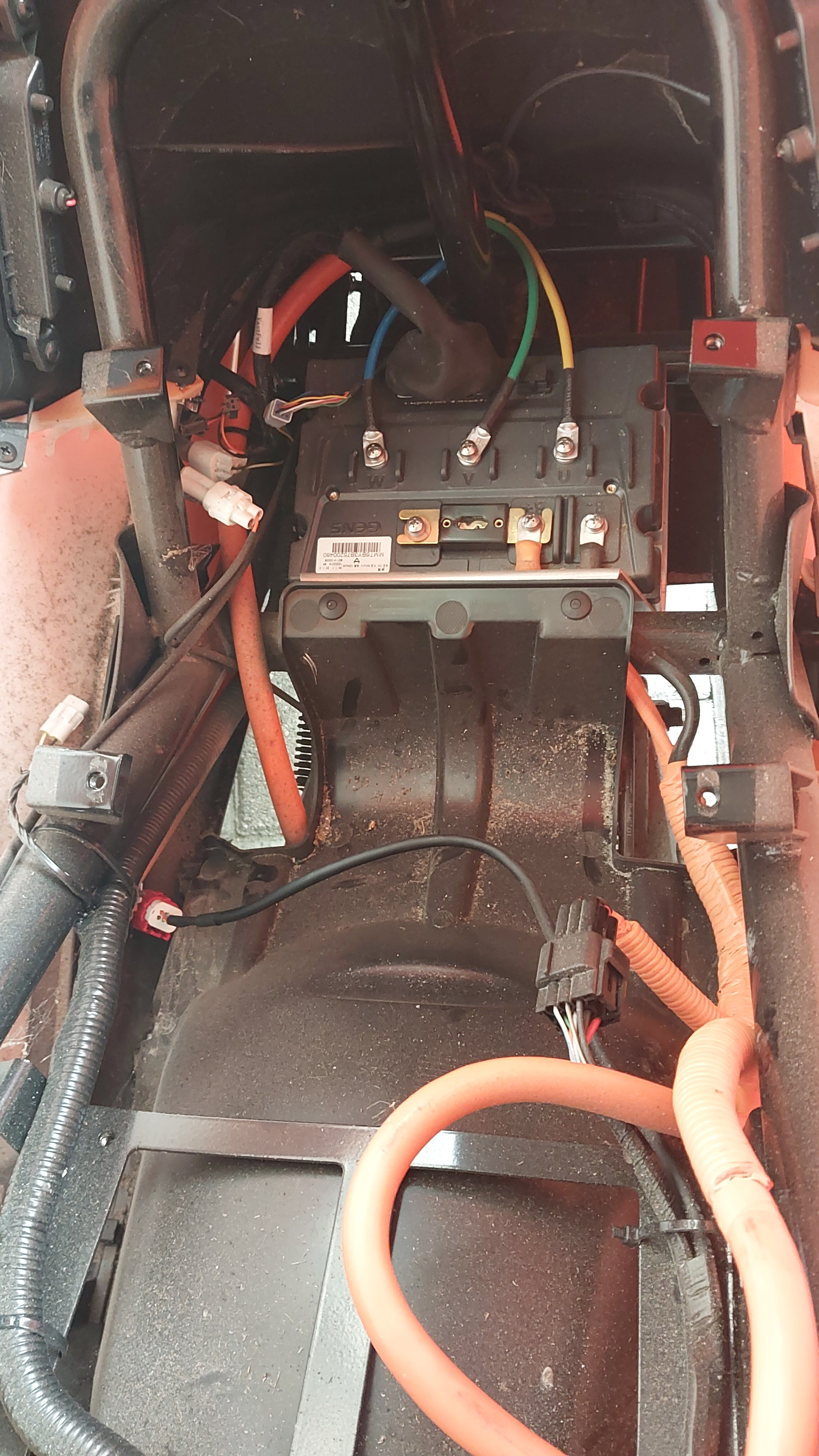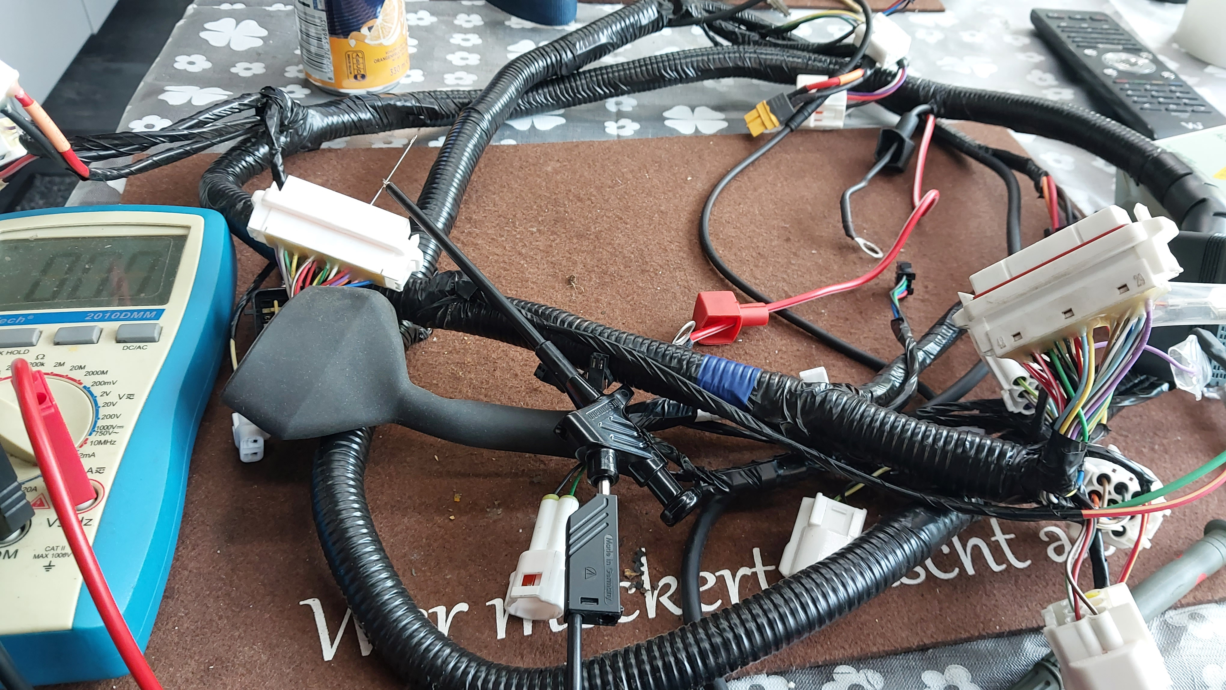 So, alle 4 Kabel vom Gasgriff zum FOC haben Durchgang, auch beim Bewegen der Stecker. Allerdings waren 3 Schrauben am FOC lose, 2 an der 200A Sicherung und 1 Motorphase. Soviel zu Inspektionsleistung.Ich habe wieder zusammengebaut und den Kabelbaum mit zusätzlichen Kabelstrapsen fixiert, ist alles nur lose reingeschmissen.Die wuchtigen Steckverbinder ebenfalls am Rahmen festgesetzt, auch unter der Lampenmaske, den Rahmen auch gleich mit Wachs konserviert.Danach war die Fehlermeldung weg und ich bin 50km vornehmlich mit 50,60km/h konstant gefahren und hatte nicht den geringsten Aussetzer.