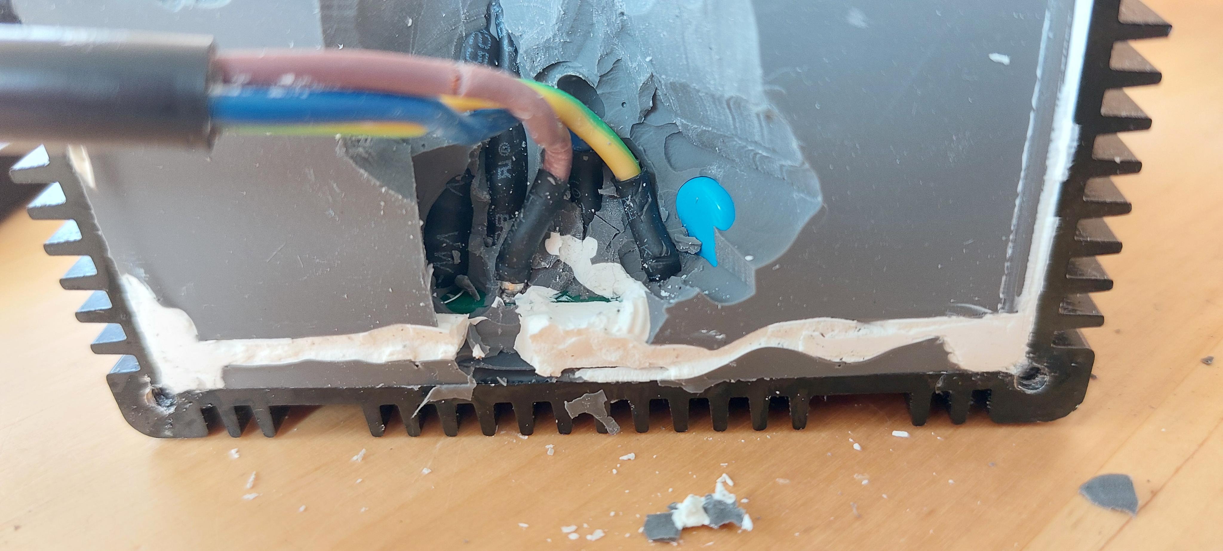 Im Bereich des kabels Stück für Stück die Masse einschneiden. Drunter ist Platine also keine Sorge.