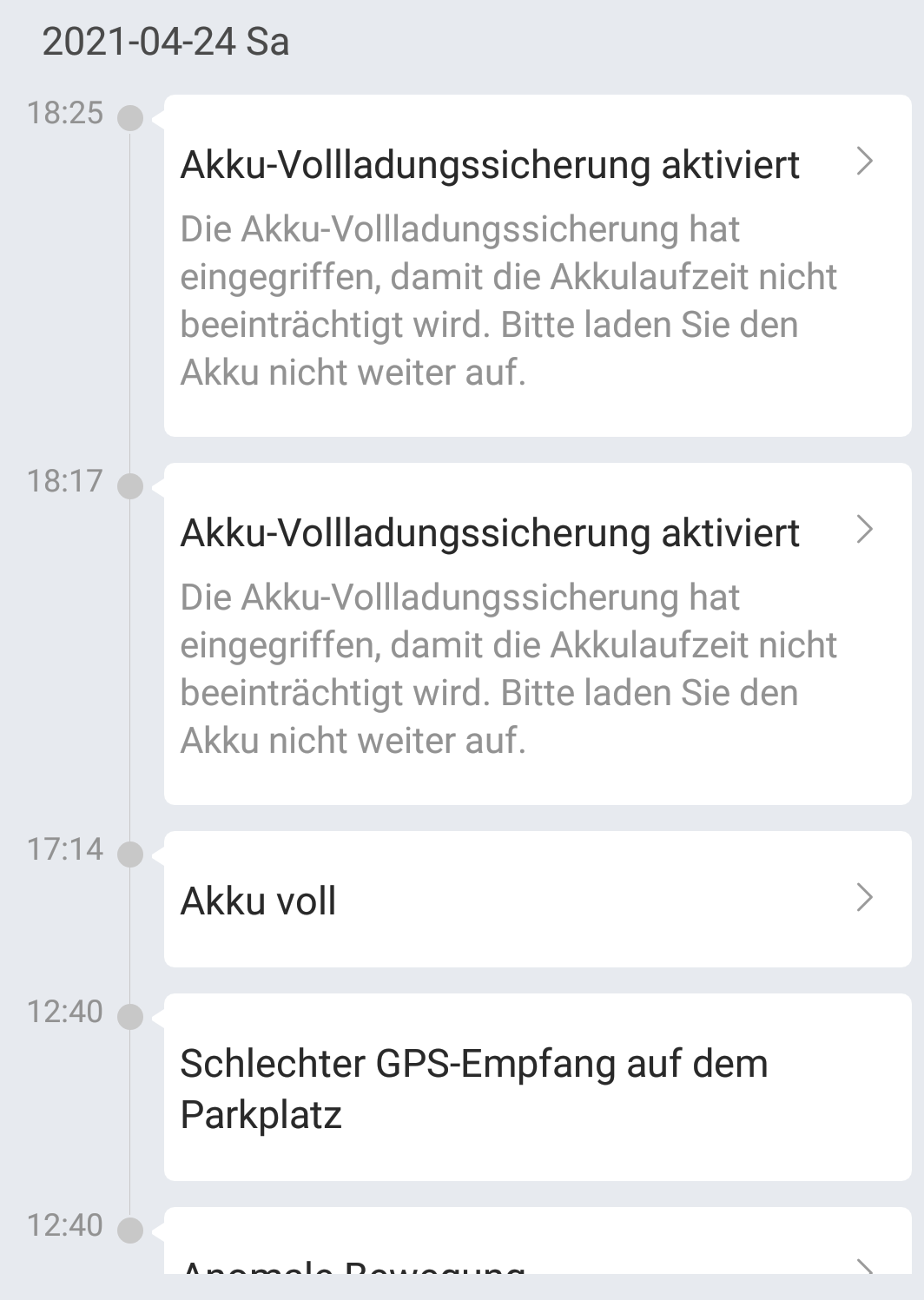 hier noch die beiden Meldungen von der App wegen dem Ladeschluss der beiden Lader. Das heißt für mich das einmal das 12A Schnellladegerät eine Abschalterkennung hat und der Roller hat eine Abschalterkennung bei dem 4A Ladegerät.