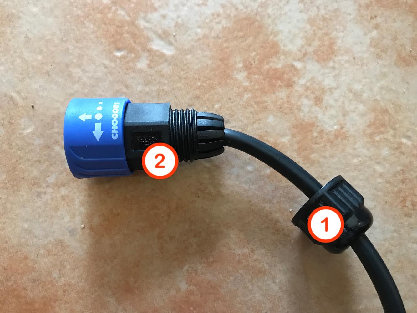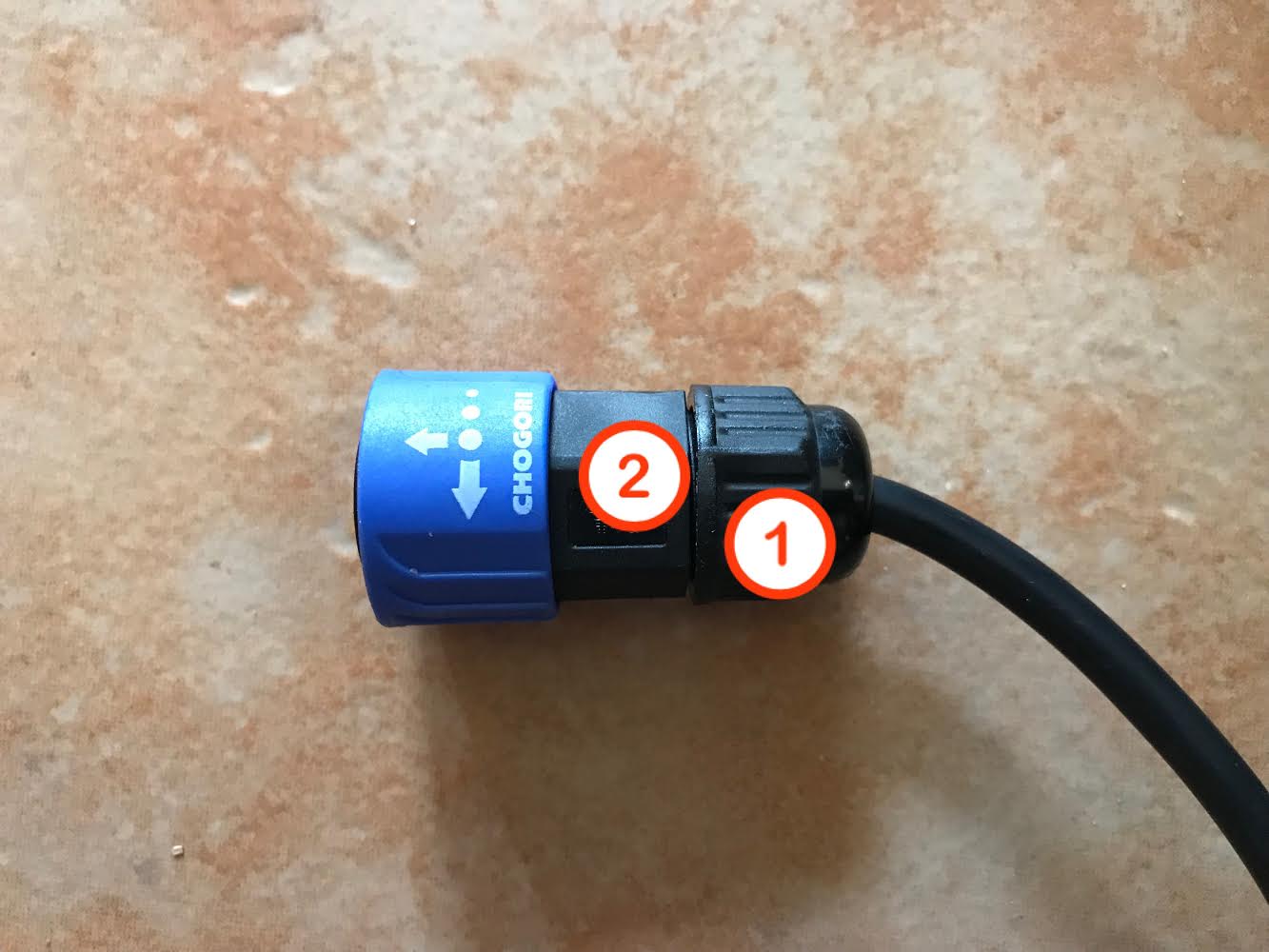Zunächst die Zugentlastung (1) entfernen, indem man die Stecker-Hülse (2) festhält und die Zugentlastung (1) gegen den Uhrzeigersinn dreht.