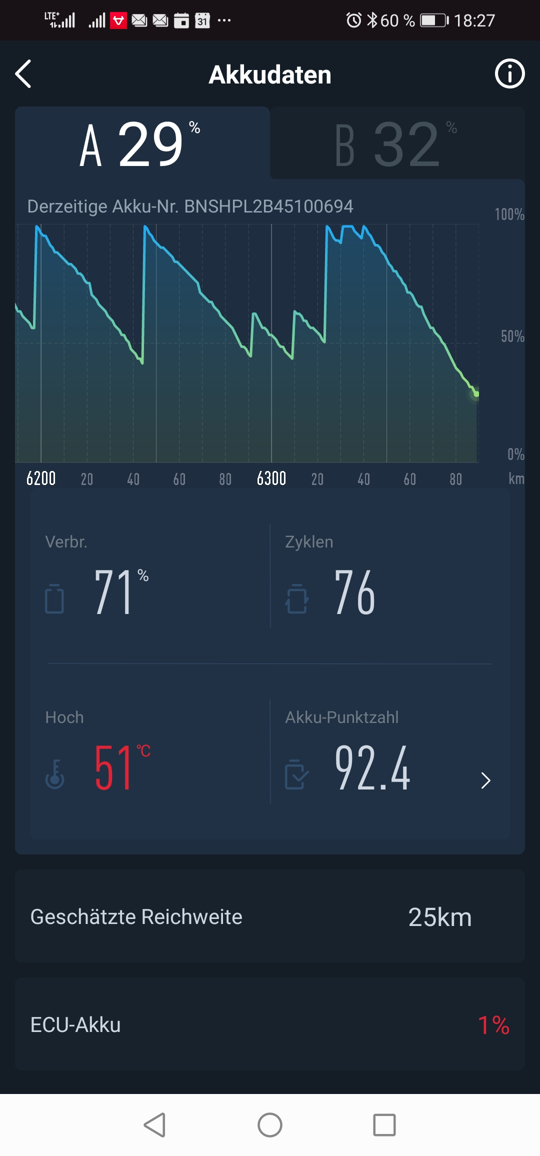 Gut - das Resultat... man kommt mit 70% Ladung ziemlich genau 50km weit. Also ca. 1,4% pro Kilometer. Im neuen Dynamic Mode mit bis zu 68km/h kommt man mit 70% 70km weit.