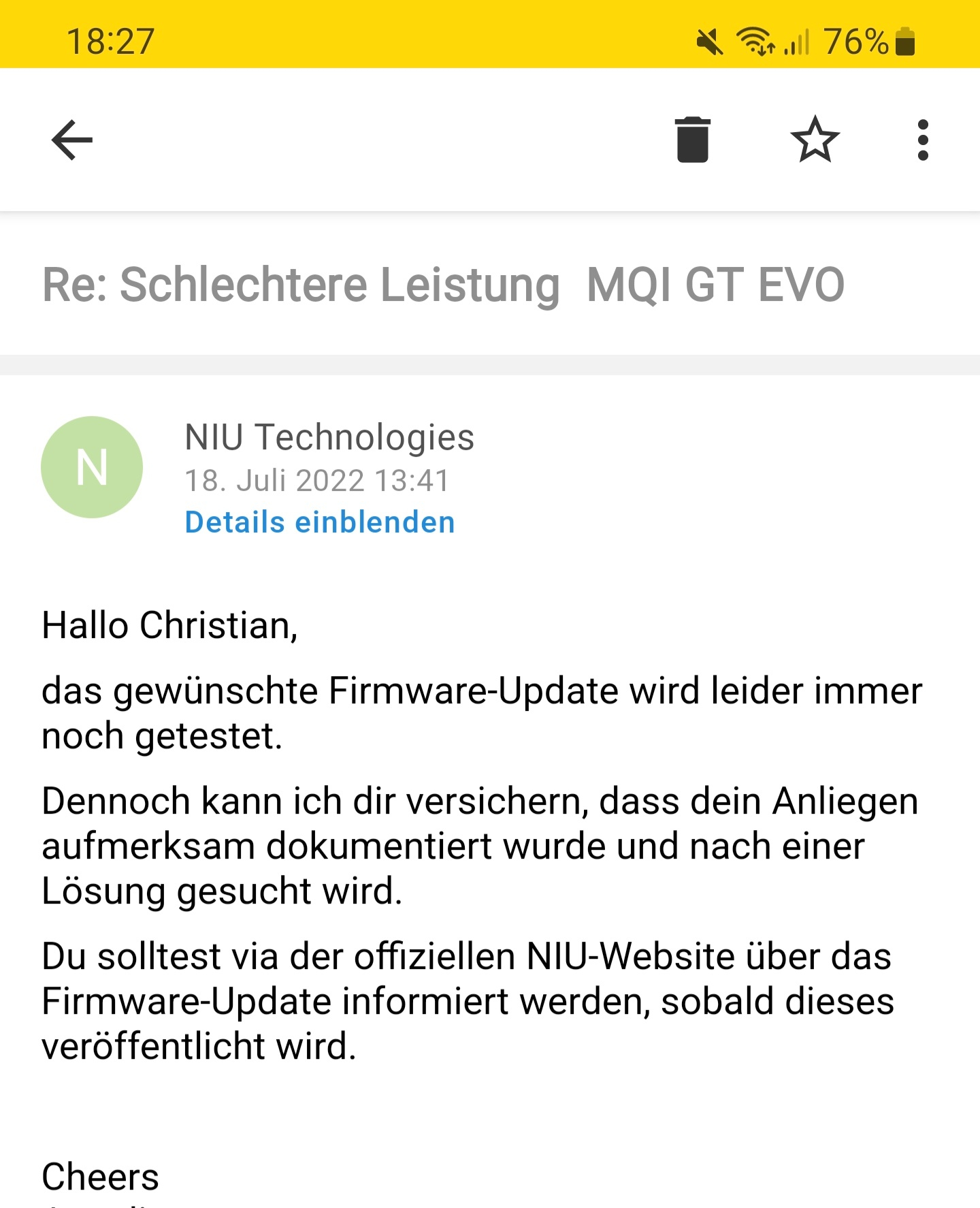 Auch wieder nicht richtig. Ich weiß aus sehr sicherer Quelle, dass NIU da ihren eigenen Mist drauf programmiert hat! Der Motor und Controller sind schon zig Jahre so in China zu kaufen! Da ist nichts neues dran auch keine Sensoren etc. Sollte Niu da dran rumgefrickelt haben, dann höchstens weil Sie meinen noch eine Markfünzig sparen zu können!