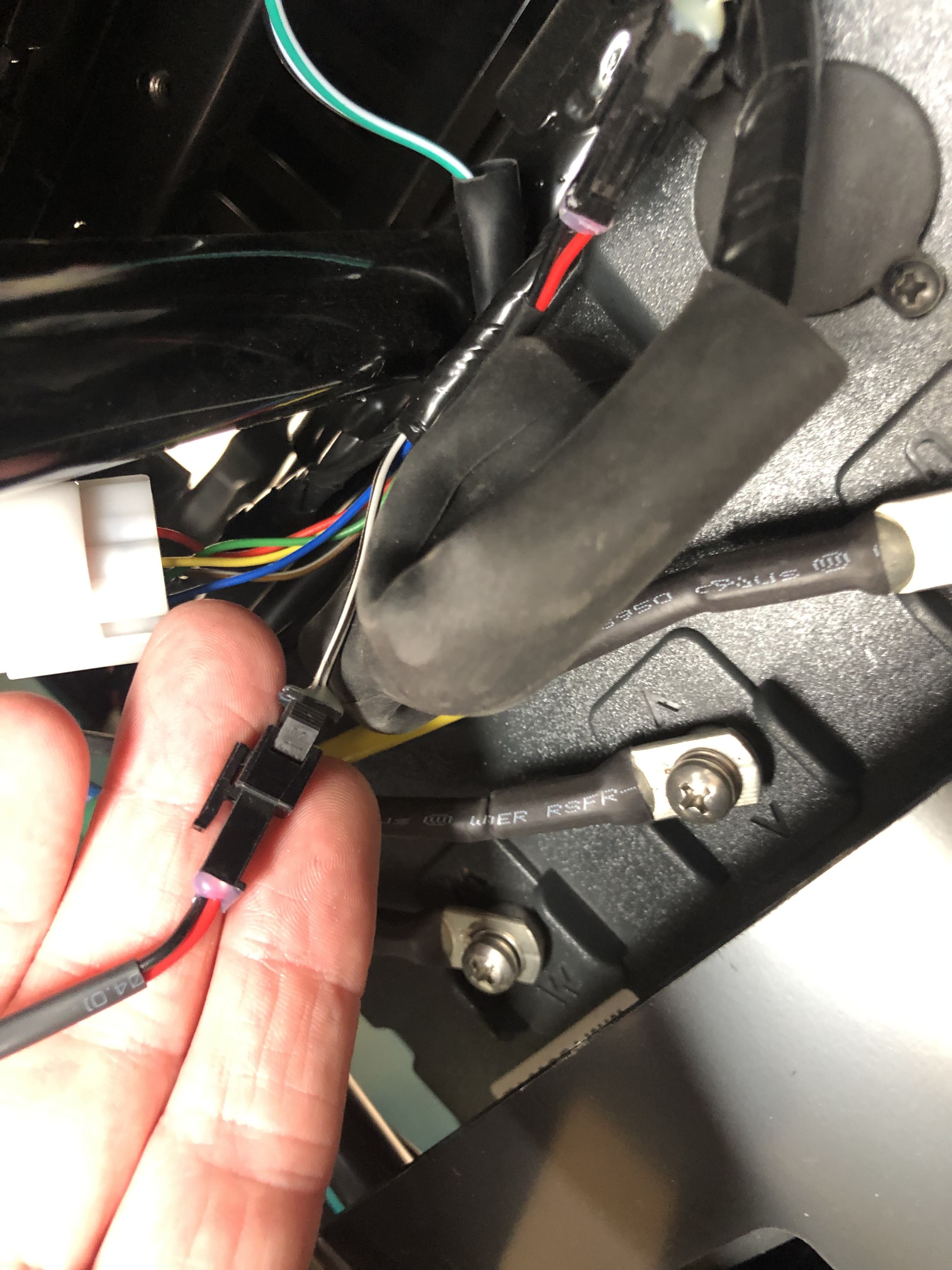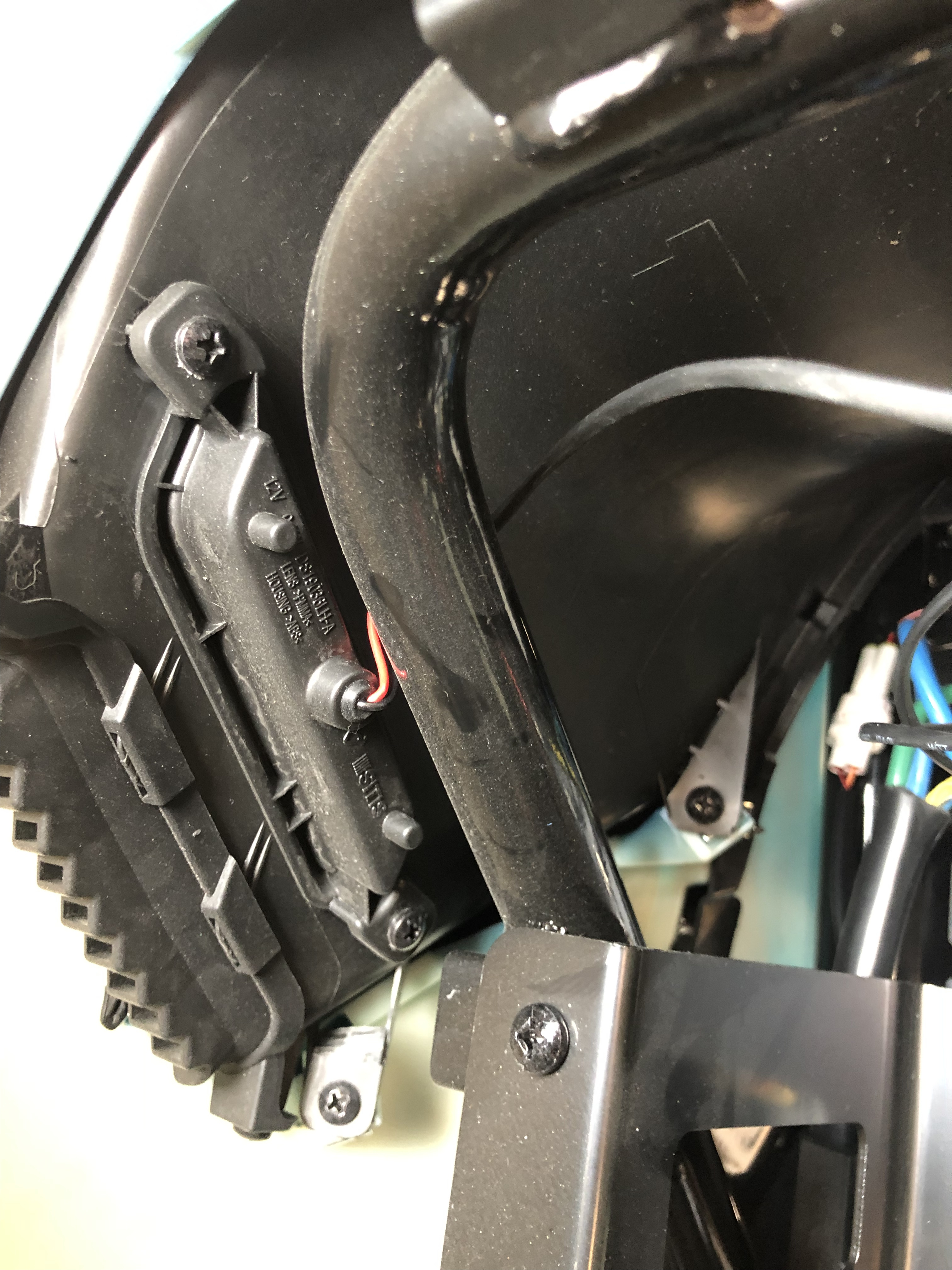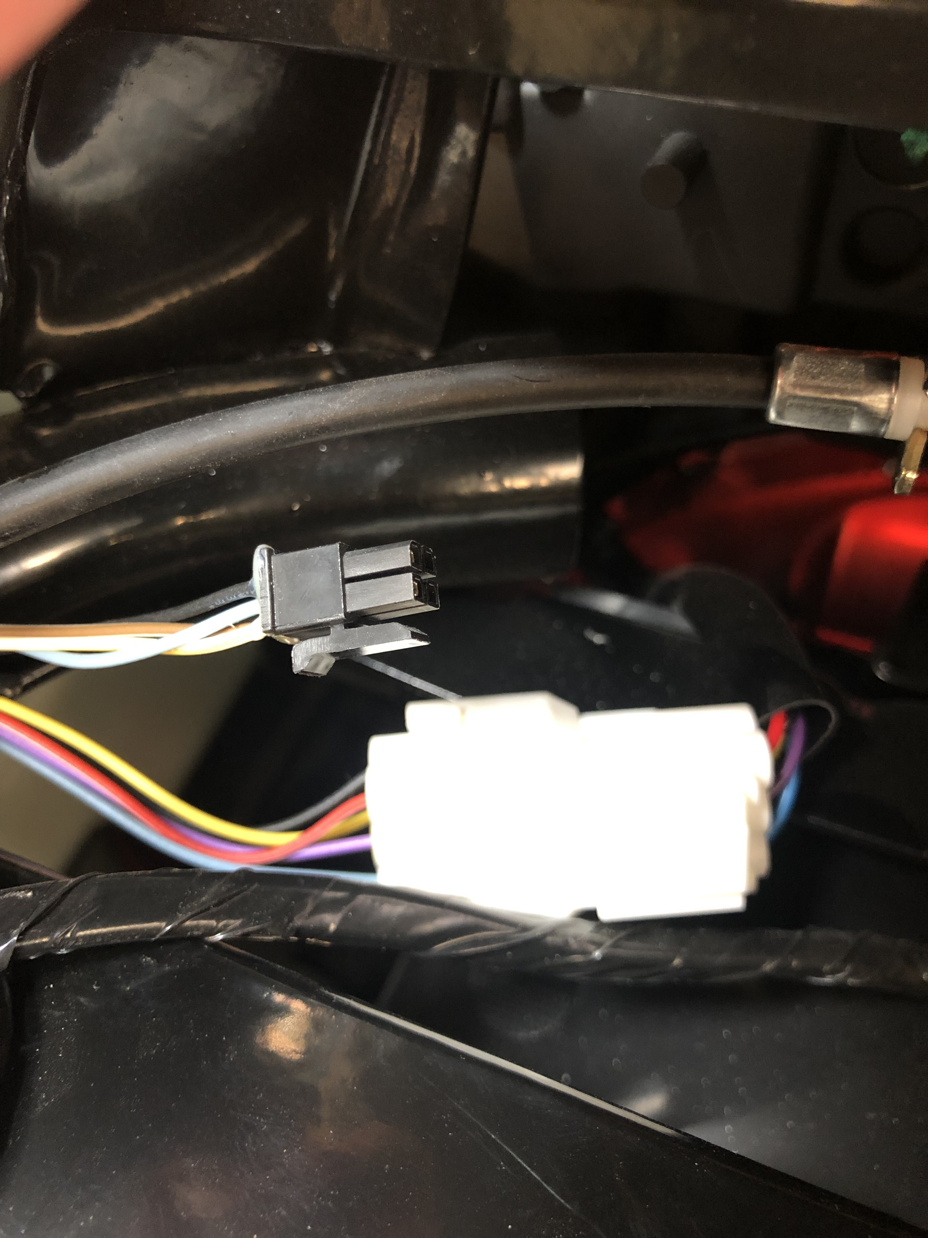 Habe auch schon das Helmfach ausgebaut und zwei lose Kabelenden erwartet… leider waren aber auch die Drähte bin den Seitenlichtern eingesteckt und verschwanden im kleinen Kabelbaum an der Seite unten (siehe Fotos).
