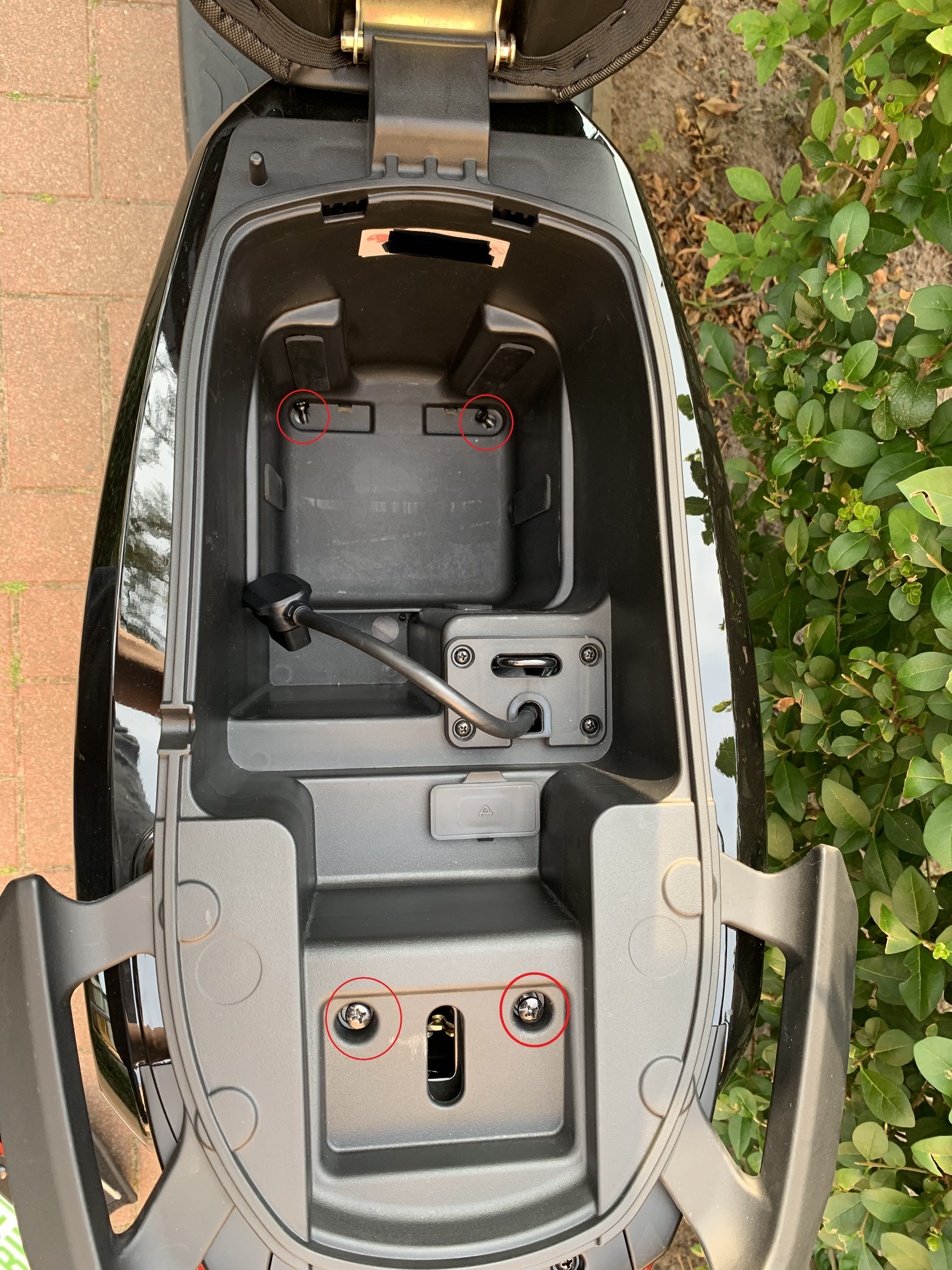 So erst muss der Akku raus. Dann die Vier Schrauben in den roten Kreisen los. Dann Vorsichtig das Akkufach anheben und nach vorne Kippen auf das Akkuanschlusskabel aufpassen. (Sitz ist am Akkufach befestigt!)